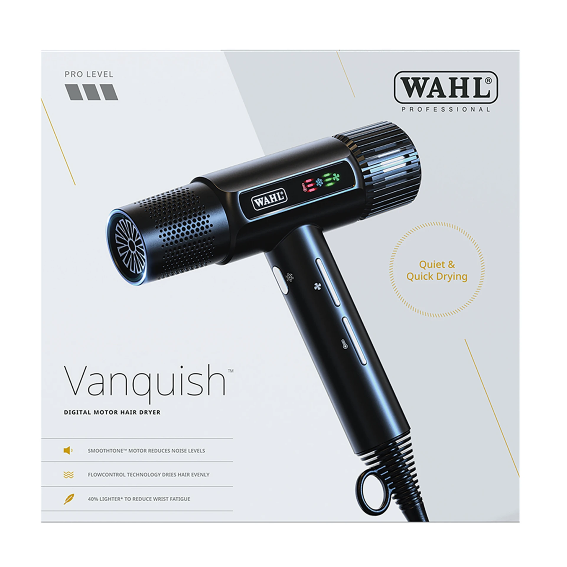 Power : 1600W Speed: 101 000 RPM Weight : 320g Airflow speed : 6,3 Magnetic concentrator nozzles Magnetic diffuser Sound : SmoothTone 4 heat and 3 speed settings Wahl Vanquish Speed DryerThe Wahl Vanquish⢠offers fast, even drying with controlled airflow and efficient power. Its SmoothTone motor reduces noise, allowing for easy conversation with clients. The slim, lightweight design minimizes wrist fatigue, perfect for extended use. |