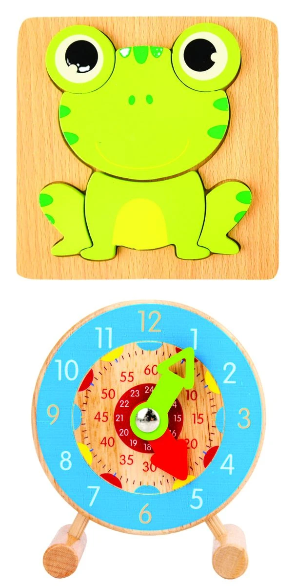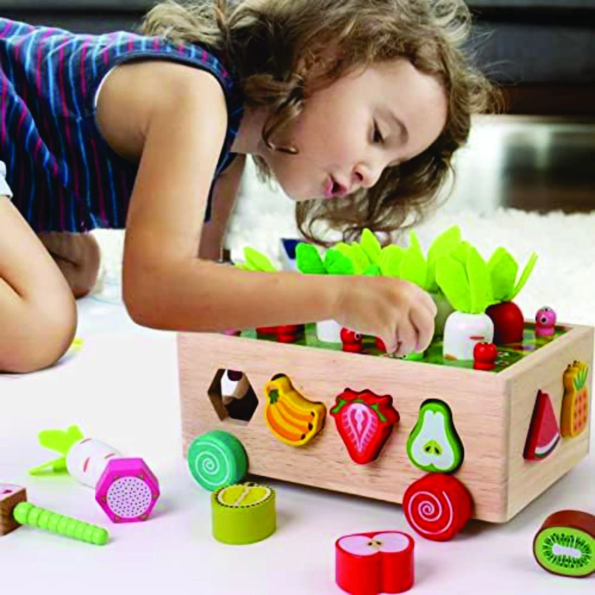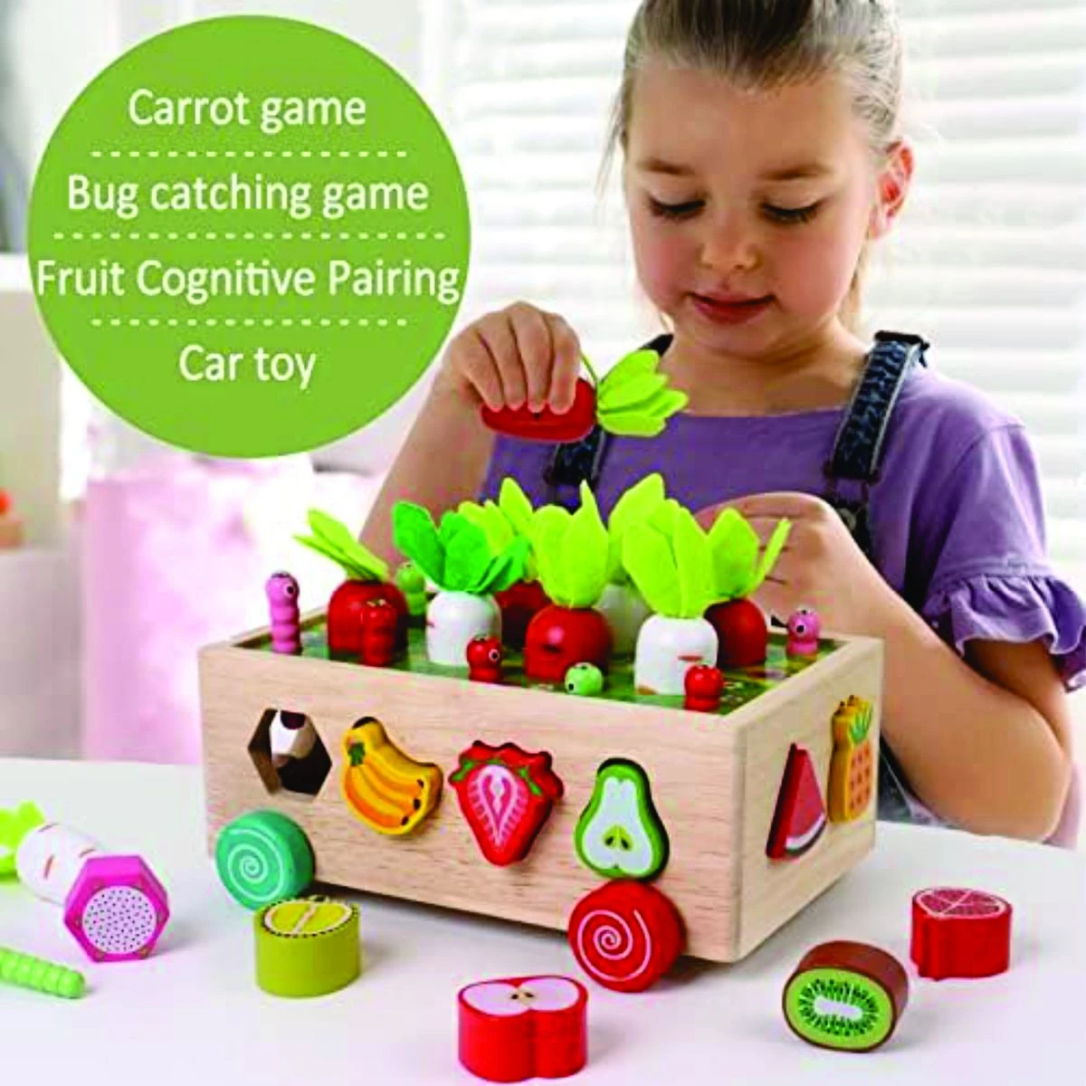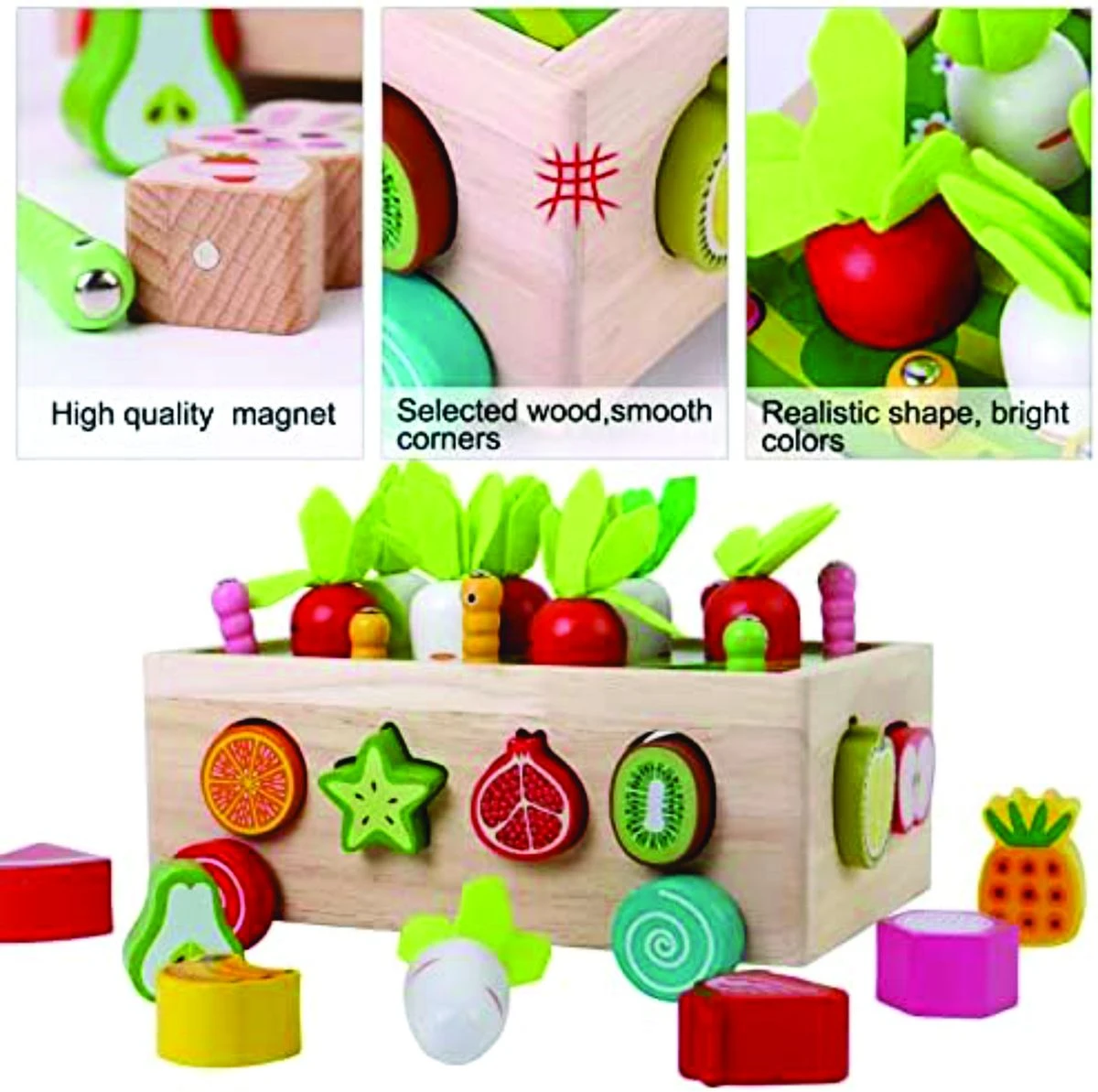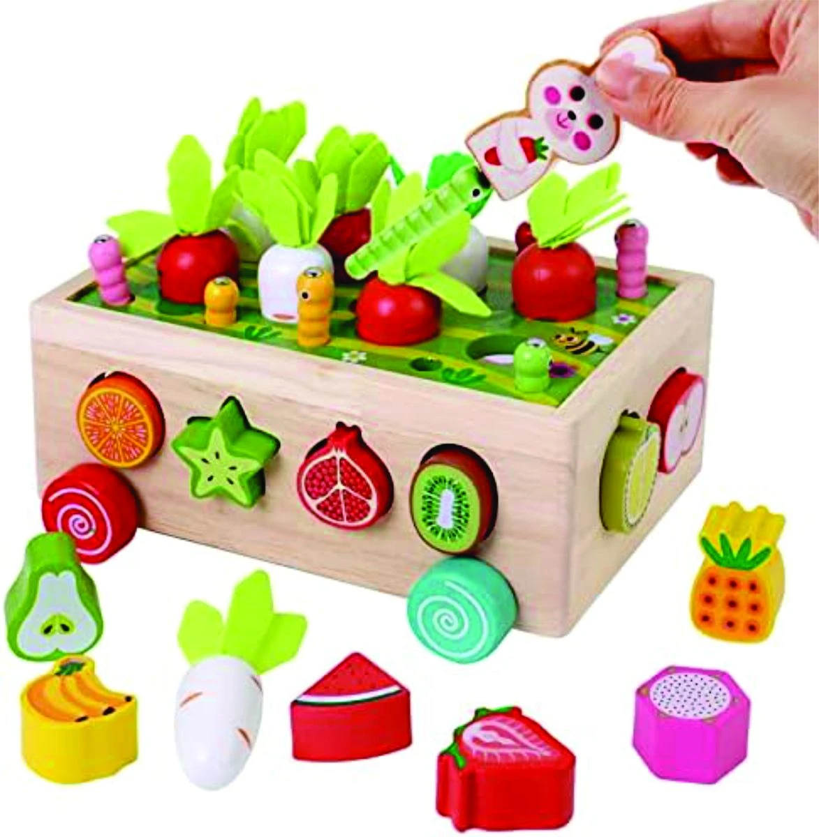 This different shapes and structures, large particles, anti-choking, burr-free learning toys can make your children to play easily and safely . The wooden toys are made of durable pine wood. Made with water-based paint and a 360 carefully polished, this toy is smooth and delicate for your kids to play safely. The lovely farmland pattern, cute worm, rabbit and the carrots looks and feels real. Ideal for sorting game or to use for more imaginative play at the farmer's market/vegetable/garden. The multifunctional farm orchard truck can play the game of radish pulling, fruit recognition, shape matching, carting, color recognition, hare catch worms, storage and sorting. A variety of playing methods can make your children happier. We recommend playing this wooden toy under adult supervision. This smart car can train a baby's crawling ability, hand-eye coordination, fine motor skills, color recognition, shape and fruit recognition. Cultivate fine motor skills, hand-eye coordination, dexterity, and concentration by matching the shape and stacking the wooden blocks. The rich scene design is more attractive to baby and makes baby more experience. This shape sorter toy for toddlers 1-3 is a great teaching tool to develop babies hand and eye-coordination as well as their motor skills meanwhile colorful fruit pattern blocks can improve toddlers' color, shape, and fruit recognition. What's in the box 1 x Toy set color sorting 1 x Watch toy 1 x Puzzles |