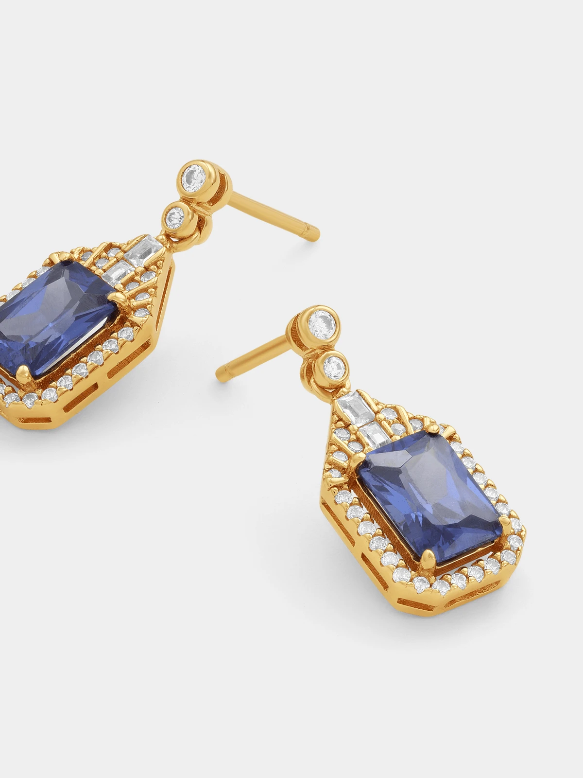 Expertly crafted in 18ct Gold Vermeil, these beautiful drop earrings feature emerald-cut blue Cubic Zirconia embraced by halos of white stones in assorted cuts adorned by round-cut stones in bezel settings. Gold Vermeil is Sterling Silver plated with a luxurious layer of 18ct Yellow Gold. The thickness of the 18ct Gold plating is at least 2.5 microns for extended durability. Dimensions + - 17mm x 8mm Material composition 18ct Yellow Gold Vermeil Fibre content SILVER Stone colour Blue & Clear Material colour 9ct Yellow Gold |
