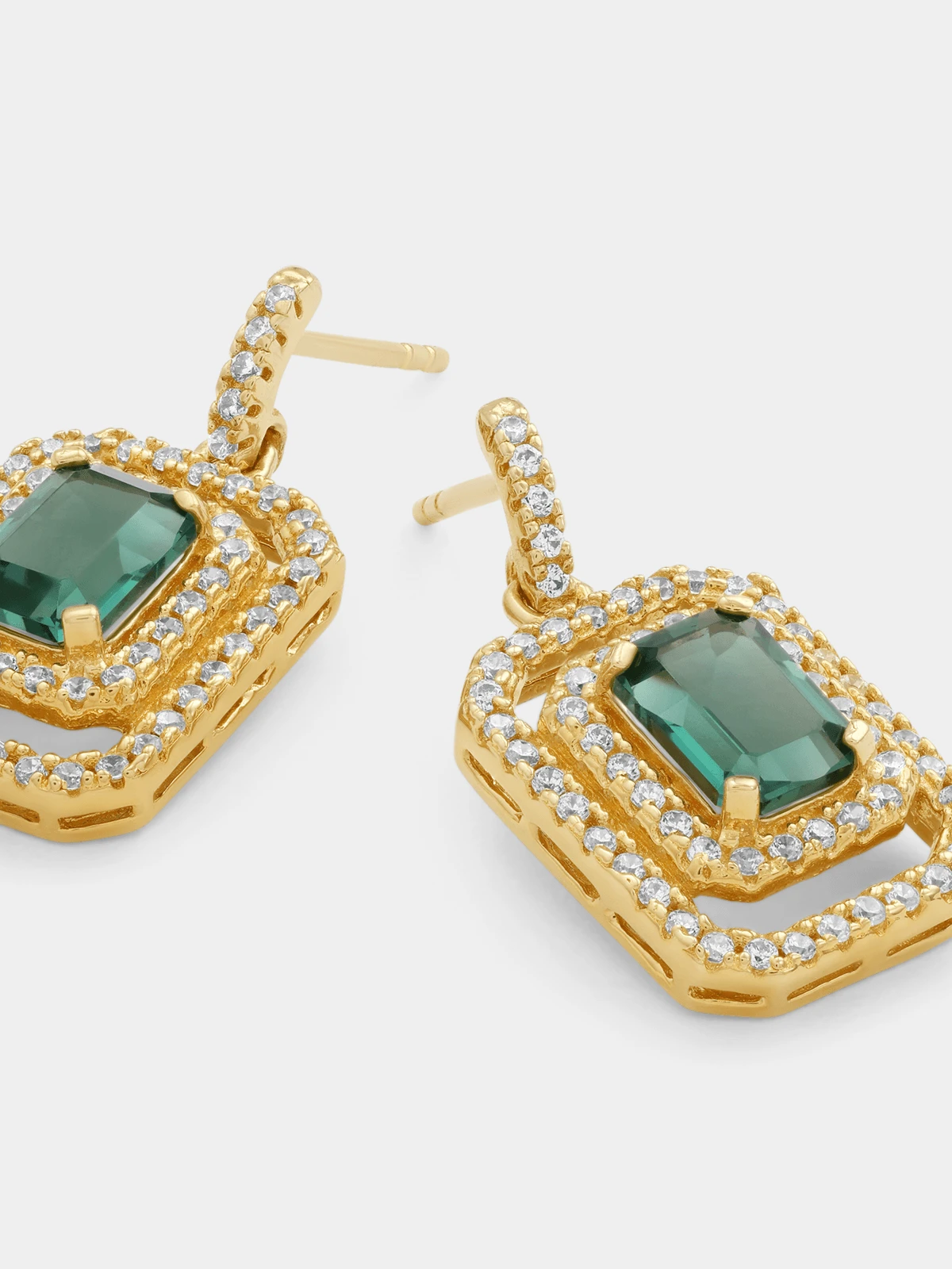 Expertly crafted in 18ct Gold Vermeil, these beautiful drop earrings feature emerald-cut green Cubic Zirconia embraced by double halos of round-cut white stones. Gold Vermeil is Sterling Silver plated with a luxurious layer of 18ct Yellow Gold. The thickness of the 18ct Gold plating is at least 2.5 microns for extended durability. Stone colour Green & Clear Material colour Yellow Gold Fibre content SILVER Material composition 18ct Yellow Gold Vermeil Dimensions + - 22.8mm x 11.6mm Gemstone Cubic zirconia |