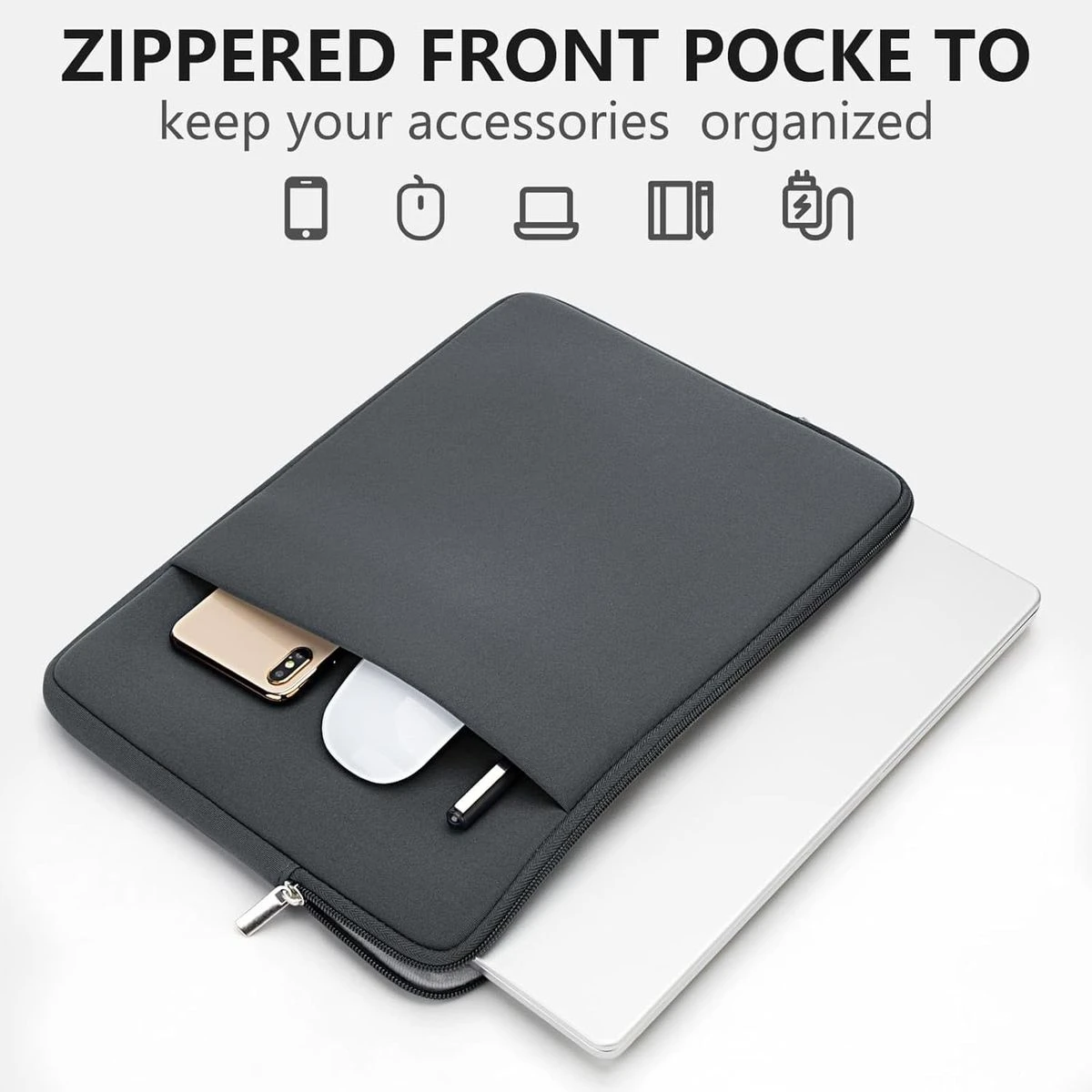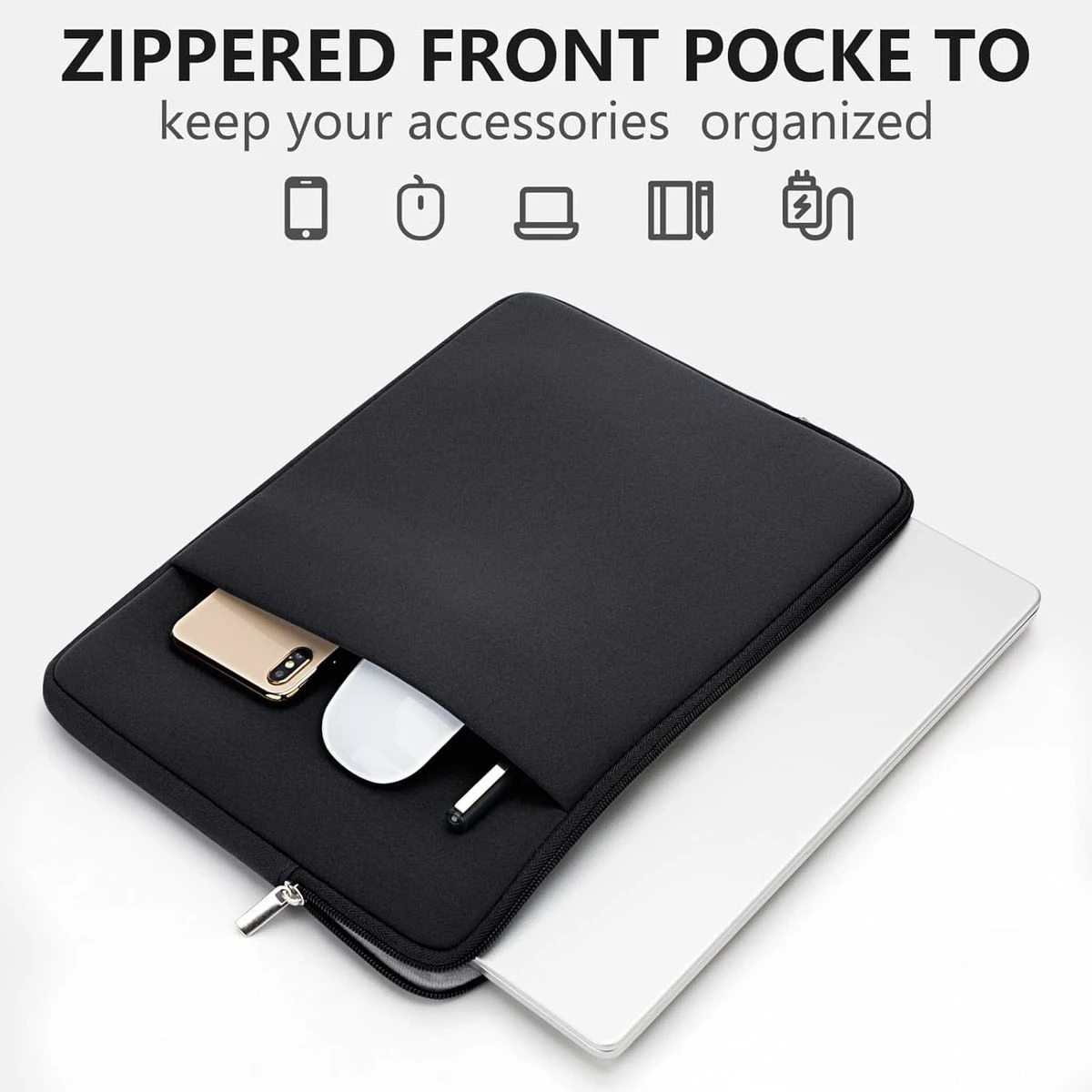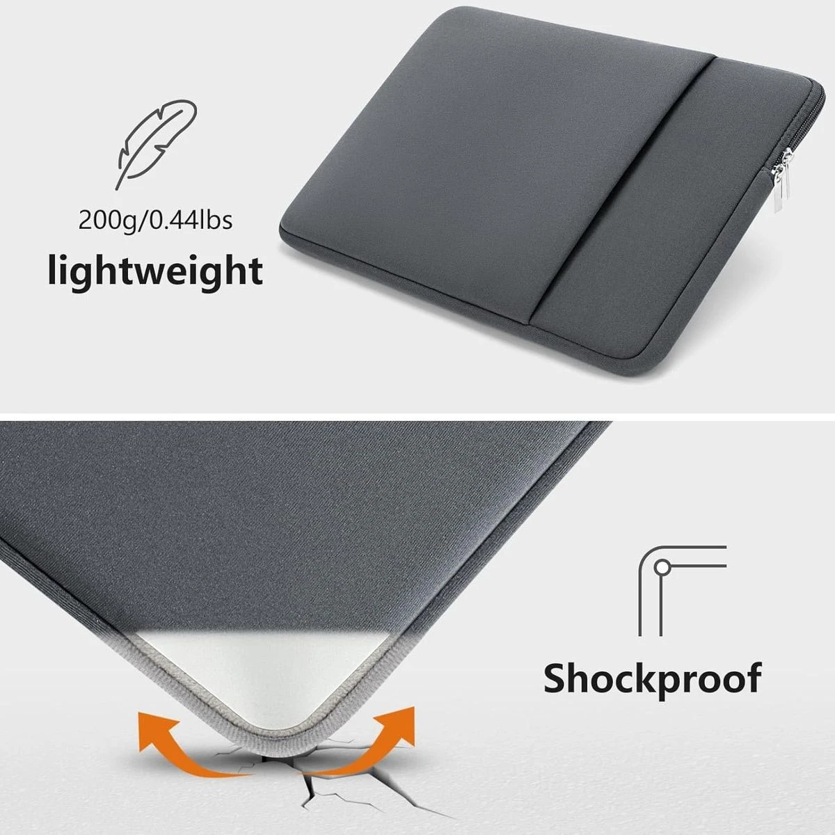 The outer layer is a soft polyester fabric that protects your laptop from dust, the padded foam as a middle layer designed to resist damage when dropped or bumped, the interior of the sleeve is an ultra-soft and fluffy material that can protect your laptop from accidental scratches. The deep front pocket is ideal for storing things like your tablet, chargers, phone, cables, mouse, pens, or other items you need quick access to. It can easily slide into your briefcase, backpack, or another bag without bulking it up. The deep front pocket is ideal for storing things like your tablet, chargers, phone, cables, mouse, pens, or other items you need quick access to. The laptop sleeve with pocket outer polyester fabric of the case enable you to carry your laptop / notebook / Ultrabook computer in a uniquely sleek style. This protective carrying sleeve case cover bag with pocket is ideal for you to take your laptop out. Slim and lightweight design allows the case to easily slide into a suitcase or backpack, dual top-loading metal zippers won't get stuck during use. The sleek and sturdy design of this sleeve ensures it protects your precious investment from dust and scratches. Features internal upgraded shock resistant bubble foam padding layer, better protect your valuable laptop from accidental scratches. You can alter how to carry depending on your needs. Allows you to switch between a laptop briefcase handbag and laptop sleeve bag. What's in the box 1 x Laptop sleeve case |