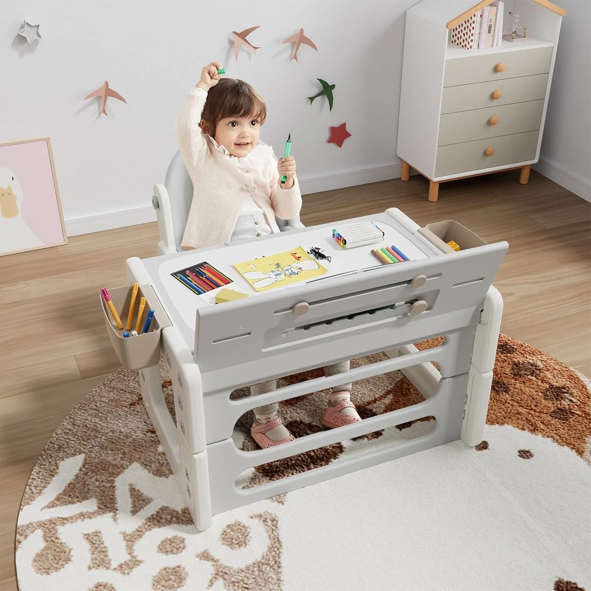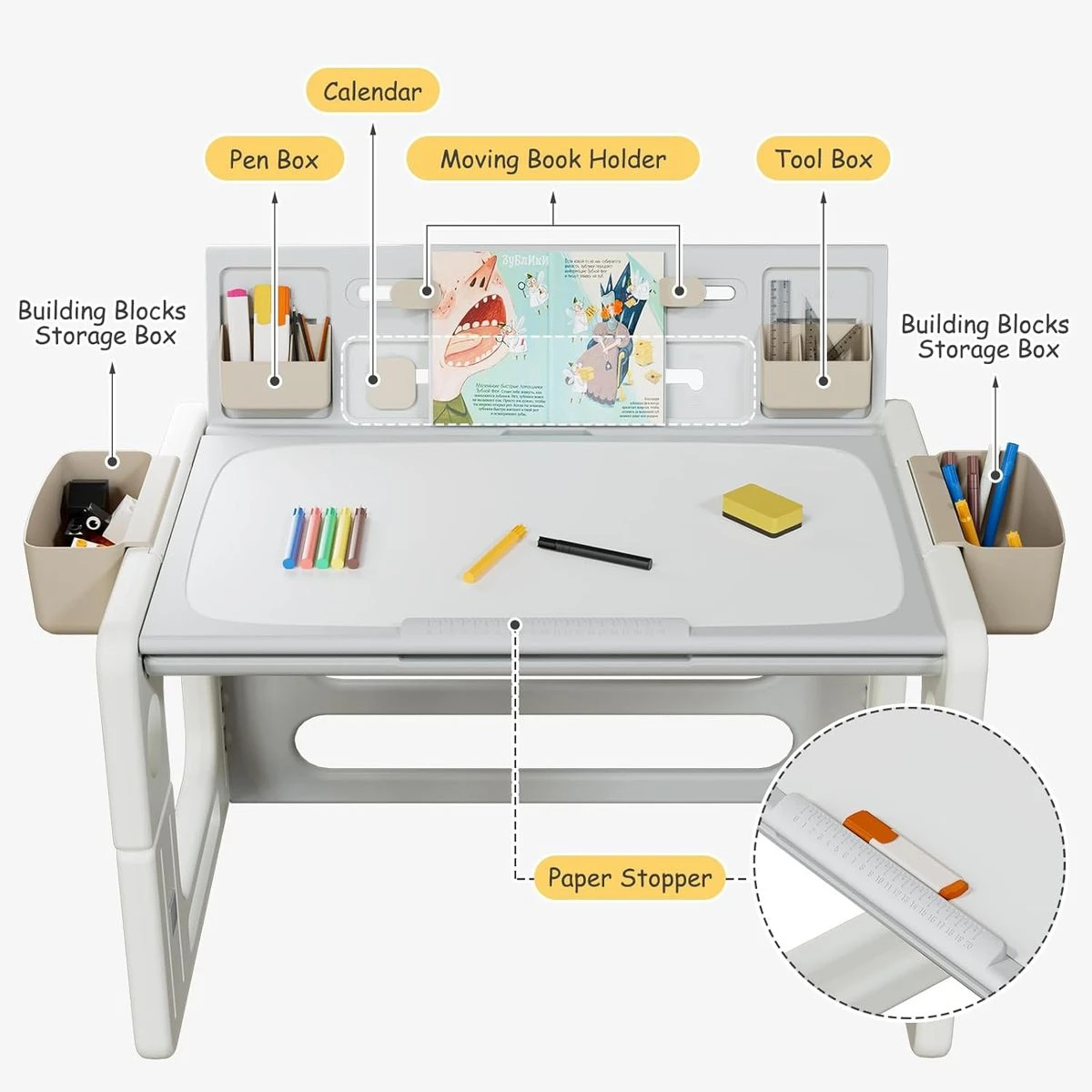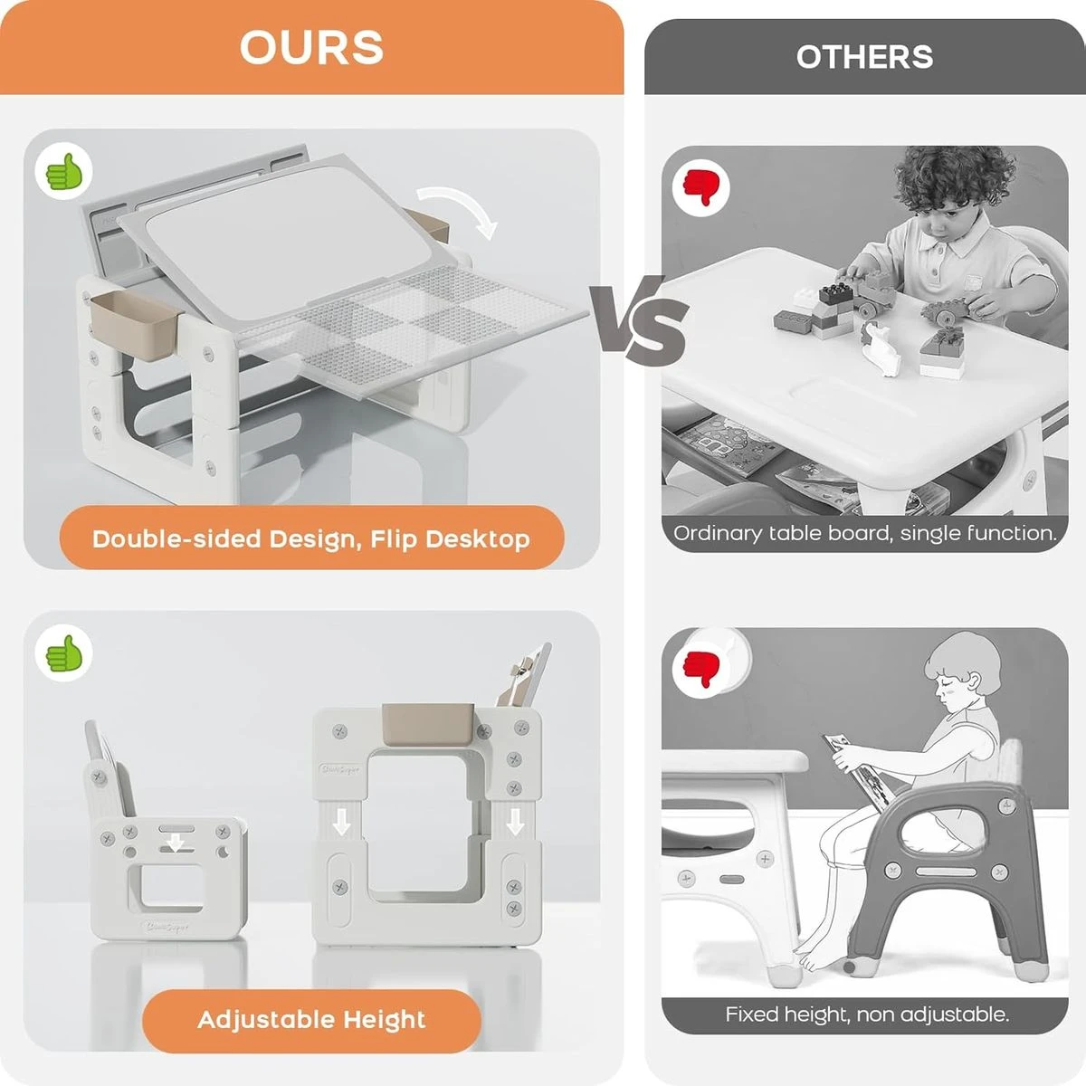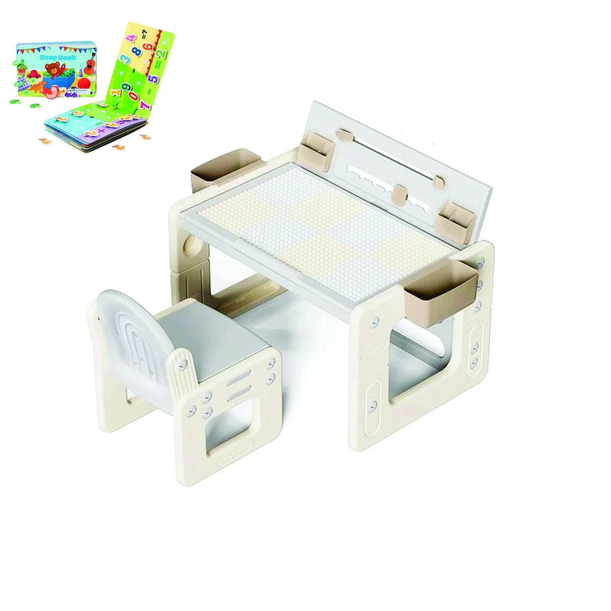 This toddler drawing table and chair set seamlessly transforms into a building block table, an erasable drawing desk, and a reading table. This table and chair set includes 1 table with a reversible table top, 1 chair, 1 set of building blocks, 5 water-based pens, 1 eraser, 4 storage boxes, and 1 set of book clip assemblies. The kids' desk and chair set is designed to grow with your child, featuring 3 adjustable height positions for the table and 2 for the chair. This flexibility ensures comfort and ergonomics as your child grows. The double-sided flip-top surface of the desk for kids offers two practical uses: a building block board and an erasable drawing surface. Additionally, the tabletop can be tilted to a 26-degree angle, providing a more comfortable position for reading and drawing. Constructed from sturdy HDPE material, this toddler table and chair set is built to last. It includes 4 storage boxes to keep blocks, watercolors, and stationery organized, and its surface is easy to clean with a damp cloth, making maintenance a breeze. The children's table & chair sets come with detailed assembly instructions and all necessary tools for quick setup. The surface can be effortlessly wiped clean, ensuring that your child's creative space stays tidy and ready for the next activity. What's in the box 1 Table with a reversible table top 1 Chair 1 Set of building blocks 5 water-based pens 1 Eraser 4 Storage boxes and one set of book clip assemblies. |