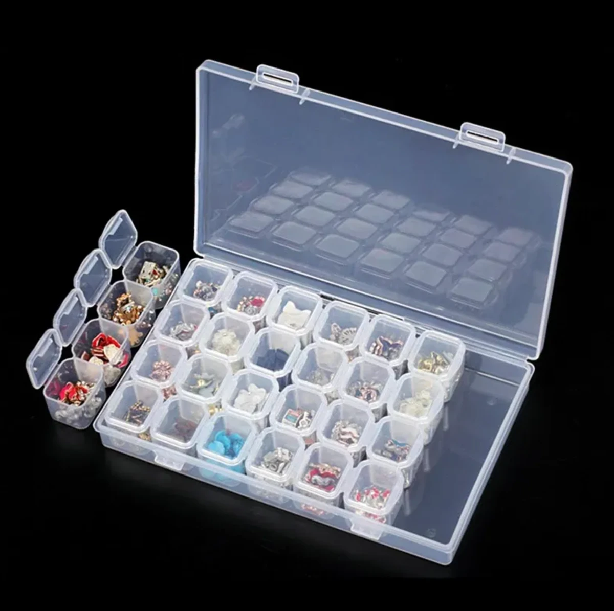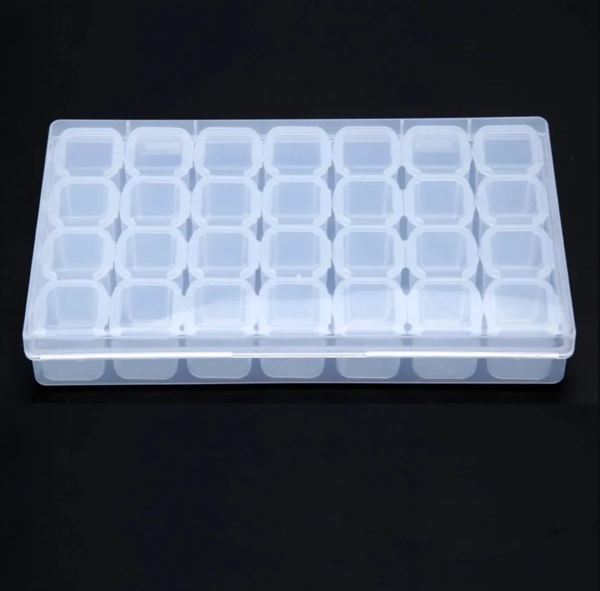Package includes 4 painting storage containers; each pack has 28 storage boxes with lids storage containers are made of durable plastic which is sturdy and not easy to break. All small slots are housed in a big box, which can double seal your things and protect them from water, dust, or rust. Snaps make the box tighter and stronger, so things don't scatter and mix. Each row can be removed for easy use and storage; blank stickers can mark the colors. You can see clearly through the transparent lid. painting storage containers are ideal for storing diamond painting supplies, nail accessories, cosmetics, jewelry, beads, and mini goods. What's in the box 4 x 28 Gird Storage Containers |