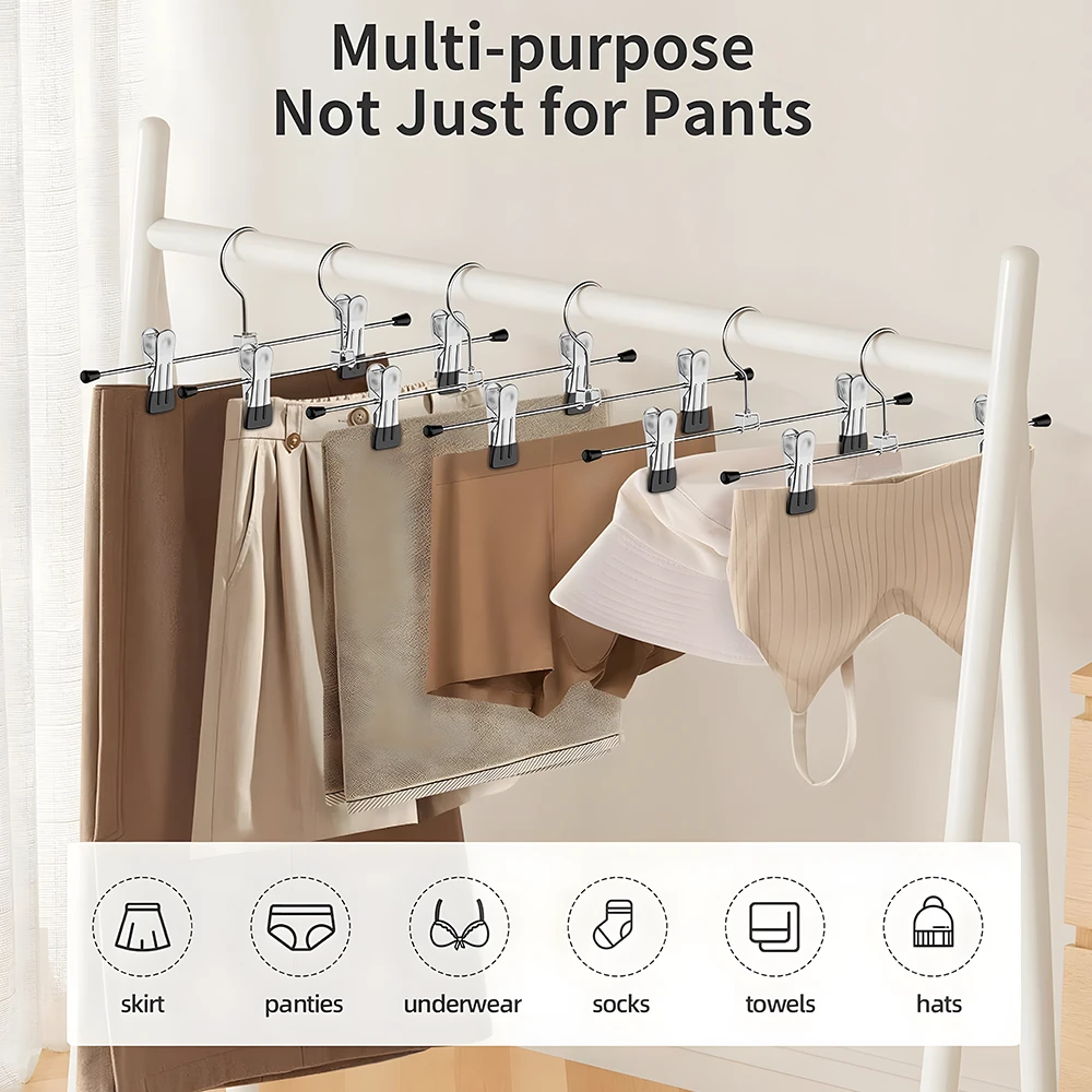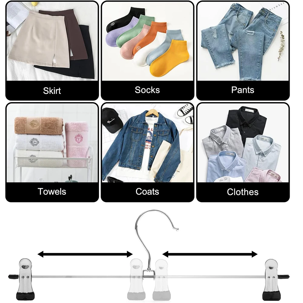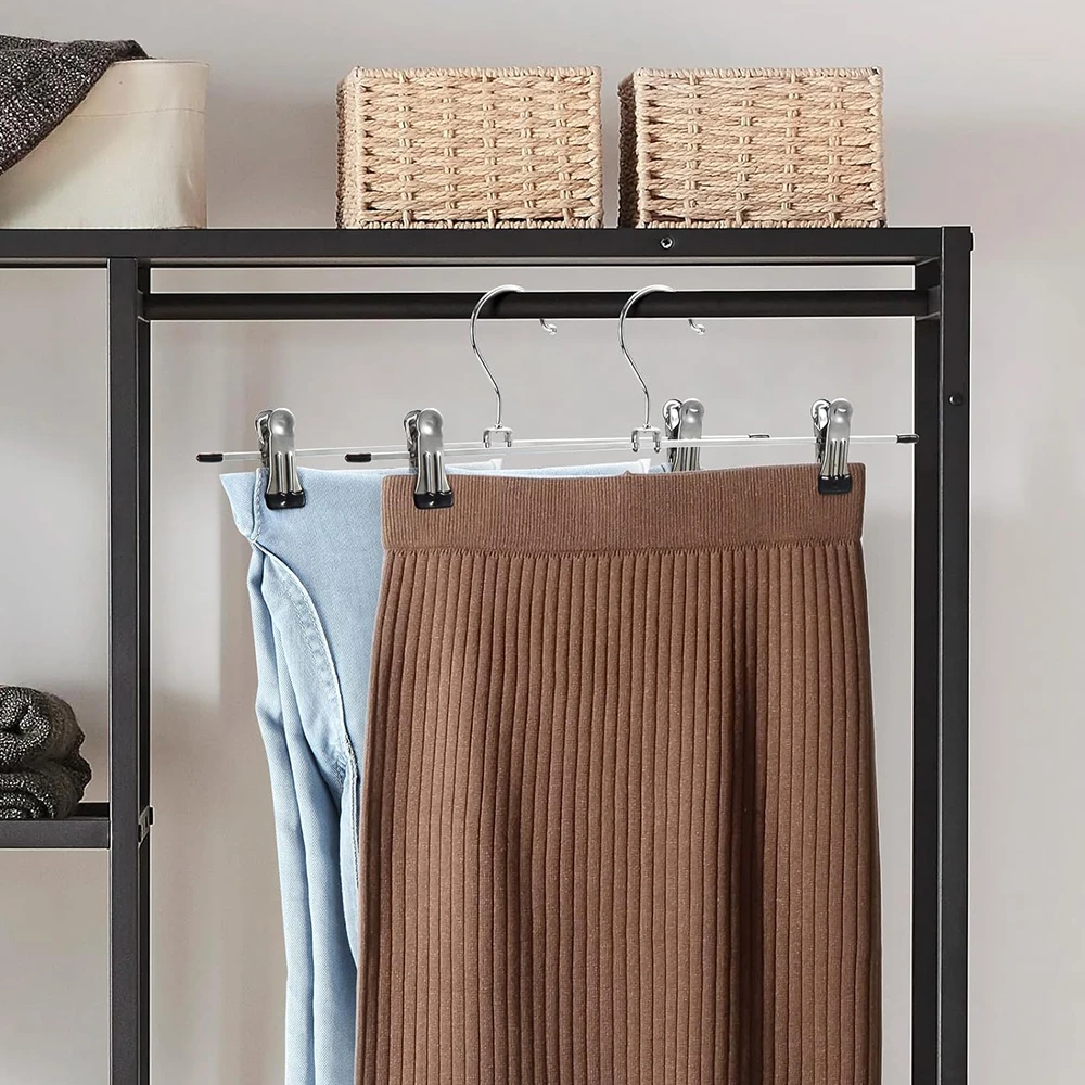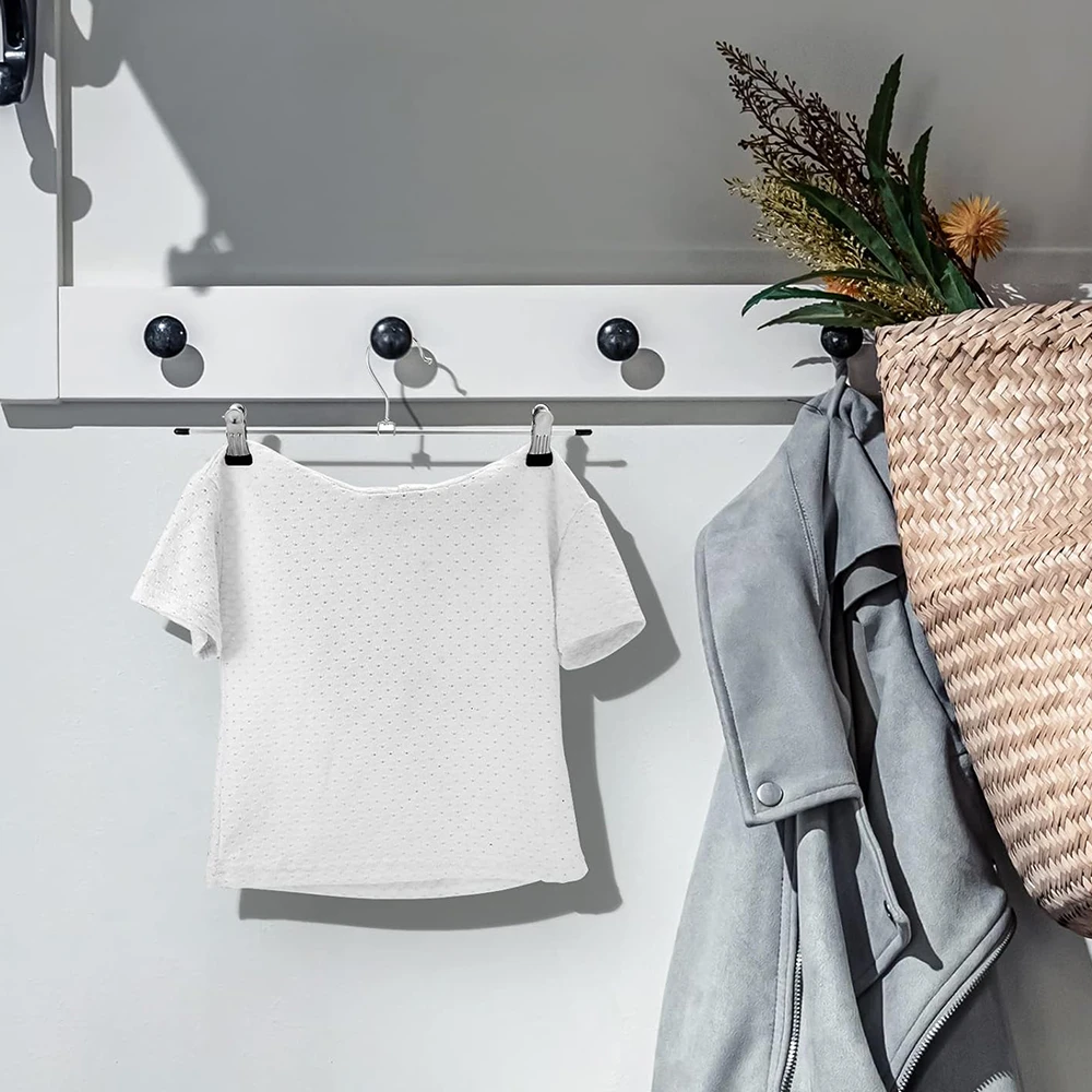 MULTIPURPOSE METAL CLIP HANGERS : Ideal for both adults and kids, these 30cm metal hangers with adjustable clips are perfect for trousers, skirts, shorts and more. Each hanger is crafted from rust-resistant metal, holding strong even under daily use. KEEPS YOUR CLOSET ORGANISED : Designed to save space while maximising storage, these slim, lightweight hangers make your wardrobe neat and clutter-free. Say goodbye to messy closets and wrinkled clothes! NO MARKS, NO SLIP : Each clip is fitted with a soft rubber end that firmly grips your garments without leaving creases or damage. Ideal for delicate fabrics and everyday wear alike. EASY TO USE & ADJUSTABLE : Simply slide the clips to your desired width - suitable for a variety of clothing sizes and styles. The hangers blend well with any closet organiser system. BUILT TO LAST : Crafted with premium-quality materials and a chrome finish, these hangers combine strength and style. They won't bend or break easily, making them a reliable storage solution for years to come. PERFECT BULK BUY OPTION : Available in value packs of 10 or 20 to fit your wardrobe needs. Whether you're refreshing your closet or organising retail stock, TopikaHome hangers offer quality and affordability. Your feedback drives our commitment to quality! Share your thoughts to help us continue delivering the best for you. What's in the box 10 x Clip Hanger For Skirts and Pants |