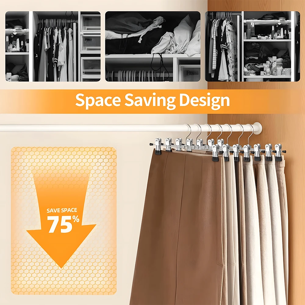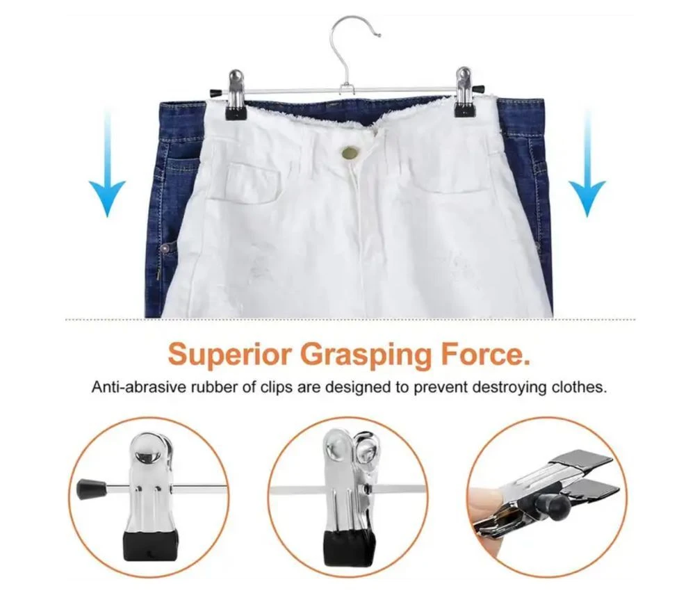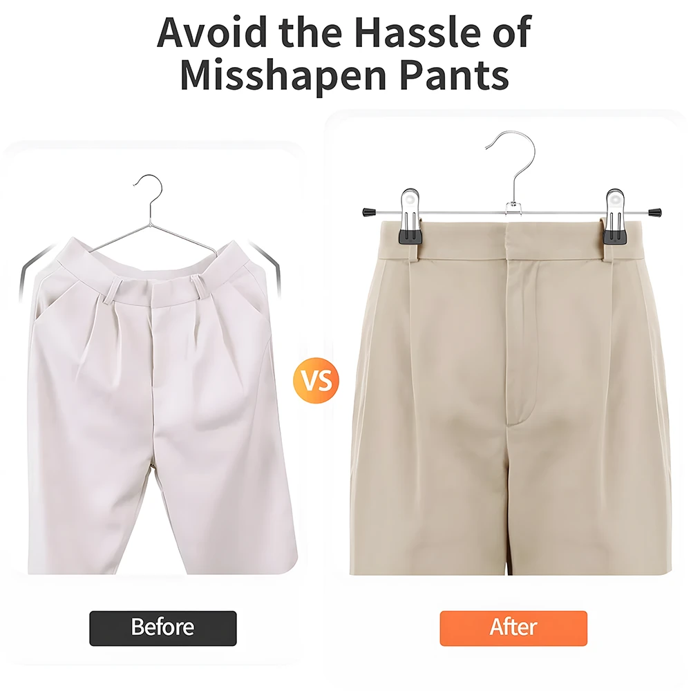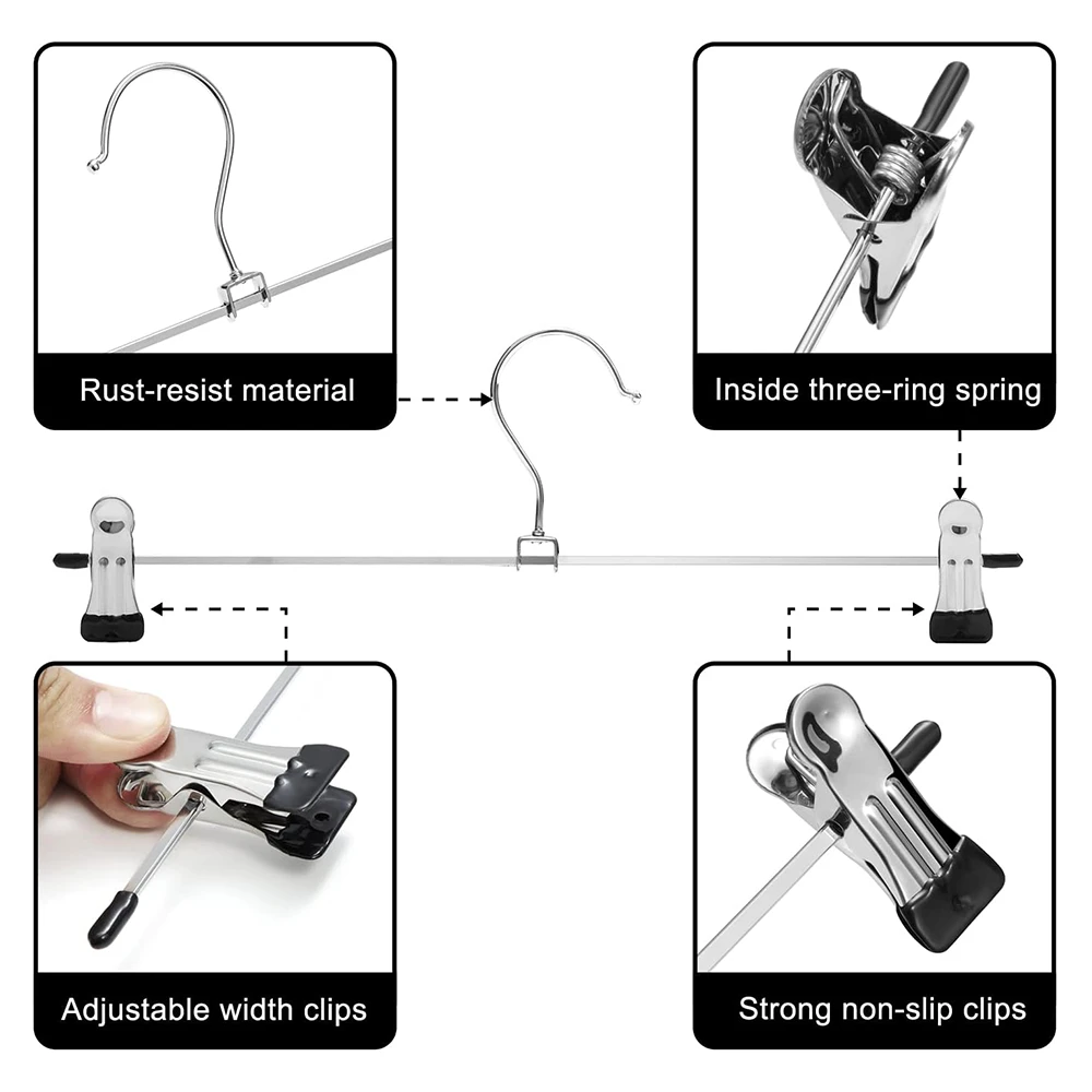 MULTIPURPOSE METAL CLIP HANGERS : Ideal for both adults and kids, these 30cm metal hangers with adjustable clips are perfect for trousers, skirts, shorts and more. Each hanger is crafted from rust-resistant metal, holding strong even under daily use. KEEPS YOUR CLOSET ORGANISED : Designed to save space while maximising storage, these slim, lightweight hangers make your wardrobe neat and clutter-free. Say goodbye to messy closets and wrinkled clothes! NO MARKS, NO SLIP : Each clip is fitted with a soft rubber end that firmly grips your garments without leaving creases or damage. Ideal for delicate fabrics and everyday wear alike. EASY TO USE & ADJUSTABLE : Simply slide the clips to your desired width - suitable for a variety of clothing sizes and styles. The hangers blend well with any closet organiser system. BUILT TO LAST : Crafted with premium-quality materials and a chrome finish, these hangers combine strength and style. They won't bend or break easily, making them a reliable storage solution for years to come. PERFECT BULK BUY OPTION : Available in value packs of 10 or 20 to fit your wardrobe needs. Whether you're refreshing your closet or organising retail stock, TopikaHome hangers offer quality and affordability. Your feedback drives our commitment to quality! Share your thoughts to help us continue delivering the best for you. What's in the box 10 x Clip Hanger For Skirts and Pants |
