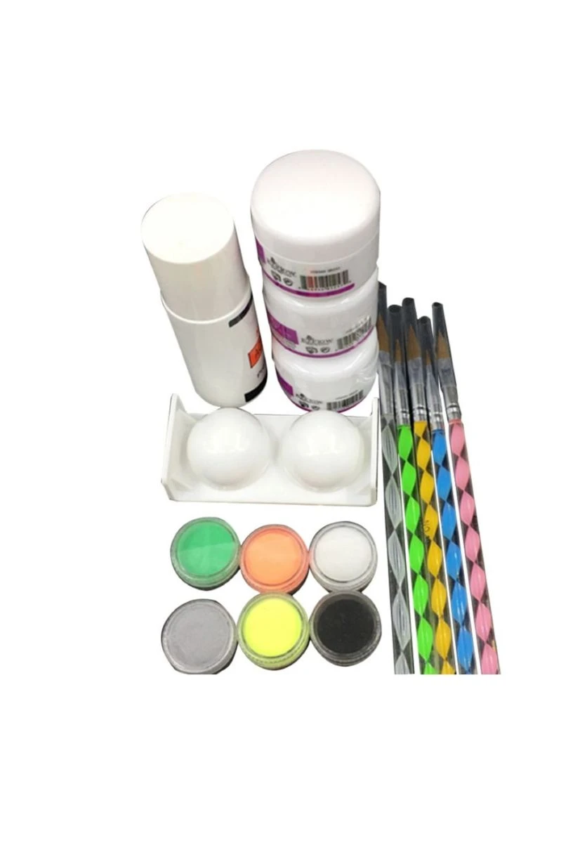 What's in the box 1 × 100 Clear Nail Tips 1 × 100 Natural Nail Tips 3 × Colour Acrylic Powders (Pink, White, Clear) 1 × Gold Nail Forms 3 × Nail Files 2 × Nail Rhinestones 1 × Press Bottle 1 × Nail Cleaner Brush 1 × Practice Finger 2 × Finger Dividers 1 × Tip Cutter 1 × Double Acrylic Cup 5 × Cuticle Wooden Sticks 1 × Tweezer 1 × Acrylic Brush 1 × Gel Brush 1 × Cuticle Pusher 12 × Glitter Pots |
