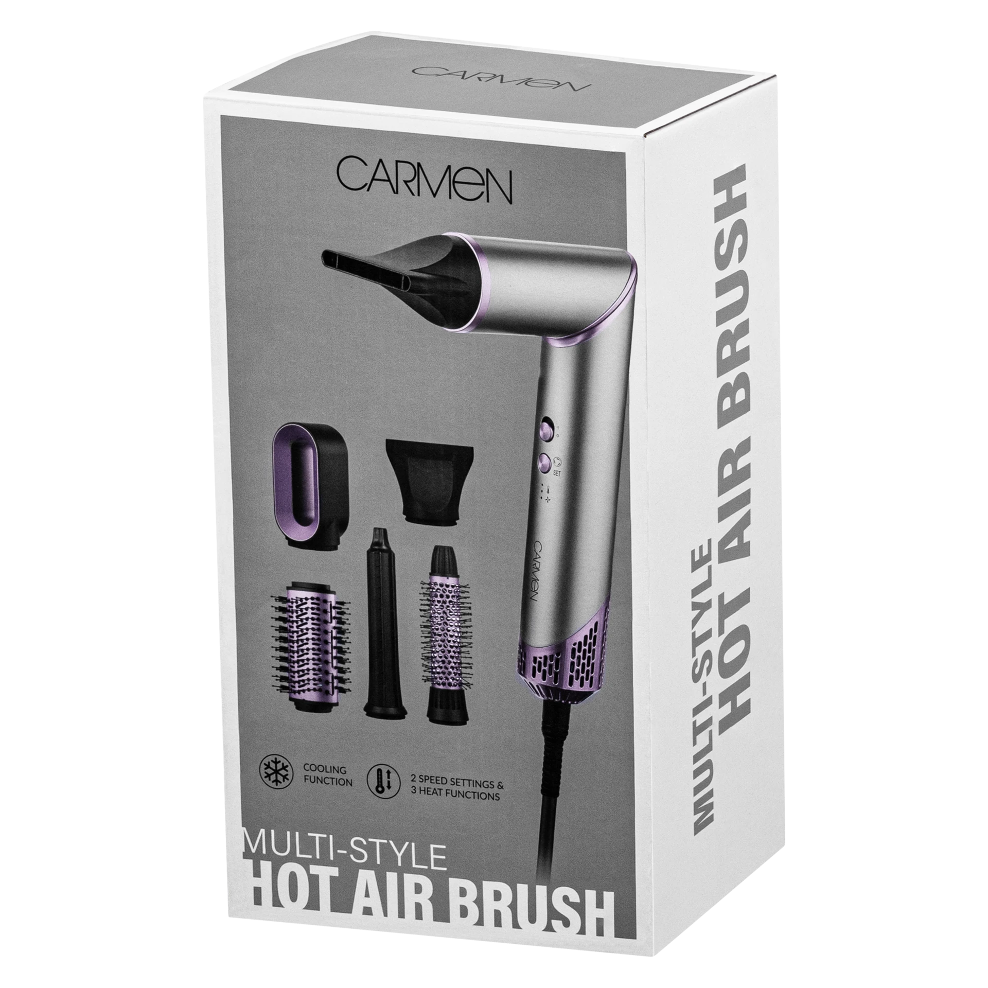 1500W powerful motor 2 speeds / 3 heat modes Cooling function included LED light indicators 6 styling accessories Carmen Multi-Style Hot Air BrushDiscover the Carmen 1500W Multi-style Hot Air Brush, your ultimate styling companion. With a powerful 1500W motor and 2 speeds plus 3 heat modes, it offers versatile control for every hair type. The cooling function locks in your look while LED light indicators keep you informed. Enjoy effortless styling with 6 accessories included, all in a sleek black, purple, and silver design with chrome and matt finishes. Perfect for professional and at-home use, this electronic-controlled brush brings salon-quality results to your fingertips. |