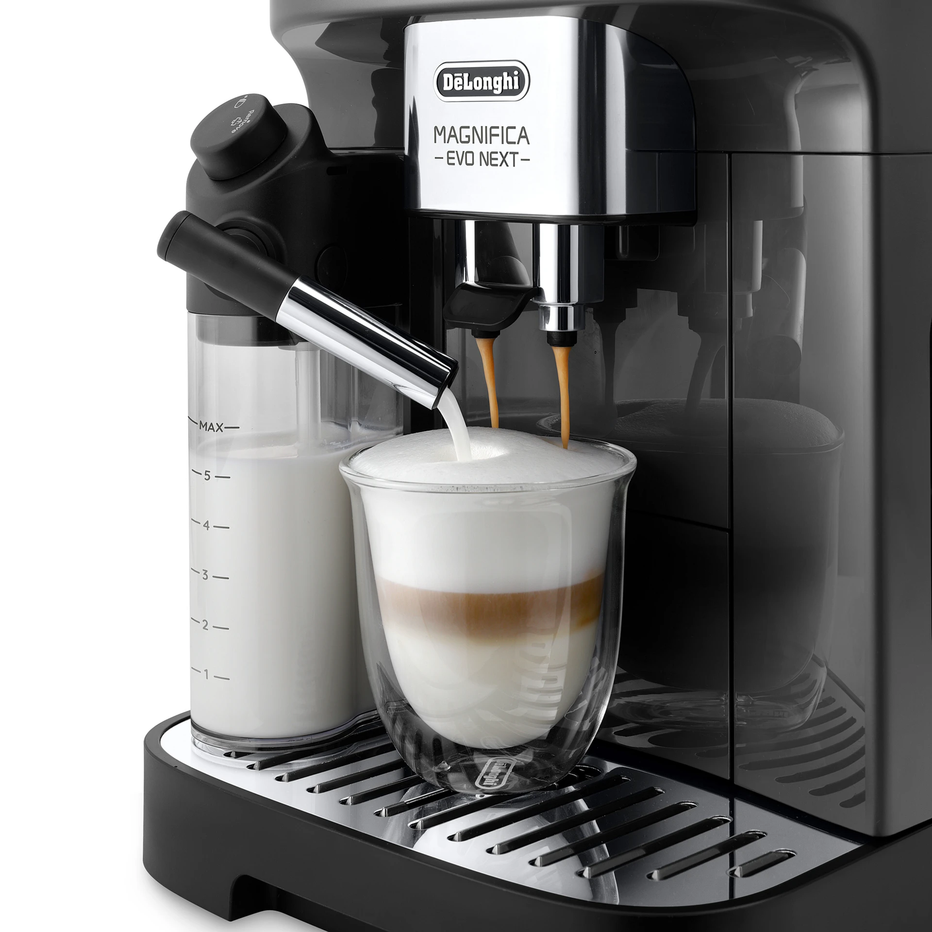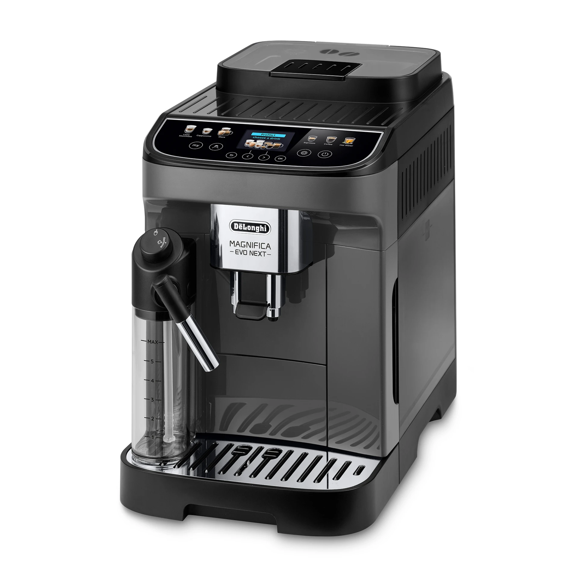 9+Function 3 User profiles 13 Adjustable grinding settings 15 Bar pressure 2.4 inch Colour TFT display 6 Soft touch button LatteCrema hot technology DeLonghi Magnifica Evo Next ECAM310,60GBExperience the perfect cup every time with the DeLonghi Magnifica Evo Next. This sleek bean-to-cup coffee maker in elegant black and stainless steel combines style and advanced features. Enjoy 10 delicious drink options at the touch of a button, personalized with 3 user profiles and 13 adjustable grinding settings. The intuitive 2.4-inch color display and soft-touch buttons make brewing effortless. Featuring the innovative LaatteCrema hot technology and a steam wand for rich milk frothing, it delivers café-quality coffee right at home. With a large 1.8-liter water tank, aroma selector, auto-clean, and memory functions, convenience and flavor are always at your fingertips. |