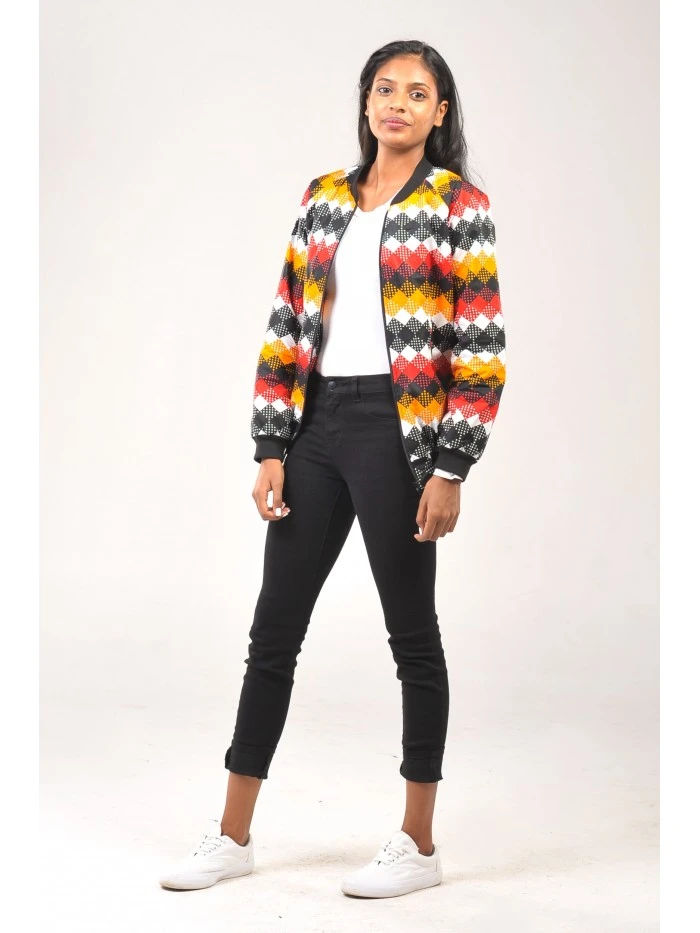 This Diamane Afriprint Bomber is a Java print; the wax is used as a laminated coating over the cotton fibers to give it that nice glossy feel Guaranteed Real African print 100% cotton / 117 gr/m² Fabrics come in a standard size of 6yards (5.5mtrs) |