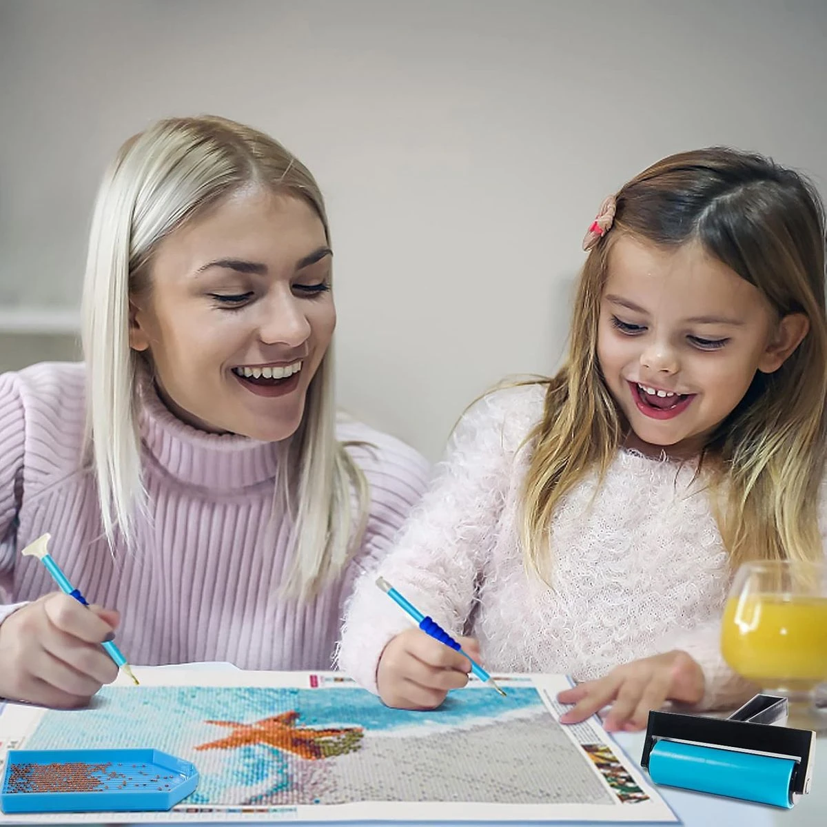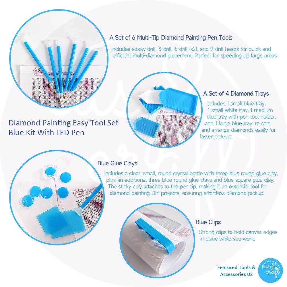 The unique and rare matching blue color is eye-catching and considers both beauty and practicality. It's perfect for personal use and also makes an ideal gift for diamond painting enthusiasts. Perfect for birthdays, Valentine's Day, Mother's Day, Thanksgiving, and Christmas. Ergonomically designed and easy to use. The roller has a smooth surface, is lightweight yet durable, and won't damage the diamond's surface, effectively helping the diamonds adhere more firmly to the painting. 1 diamond painting roller, 1 corrector, 1 tweezers, 1 storage box, 1 fixing pen, 3 diamond pens, 1 blue tool bag, 2 label stickers, 4 pen holders, 10 adhesive wax, 20 plastic bags, 2 diamond trays. It comes with a handy 28-grid storage box, storage bags, label stickers, and two trays of different types of diamonds, helping you easily distinguish and store all the different colored diamonds. The sturdy zippered bag can hold all the components. No more worrying about losing small items. What's in the box 1 x Diamond painting tool |