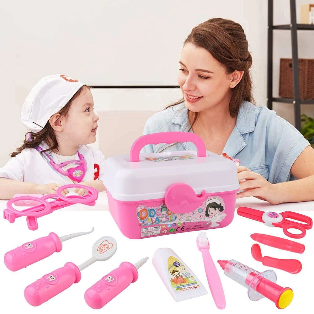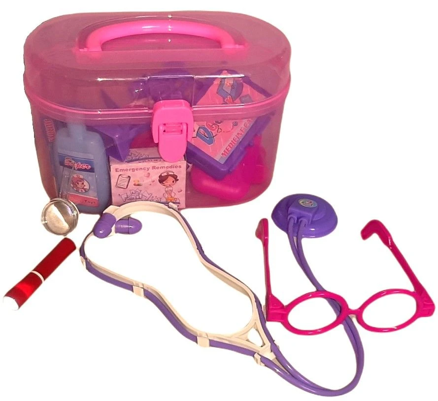 The Top Reasons for encouraging children to pretend play and 'make belief' are: Features: - To encourage imagination and creativity - To support social and emotional development - To improve language and communication skills - To develop thinking, learning and problem solving abilities - To enhance physical development - To improve hand-eye coordination - To learn about shapes (for toddlers) This play set will provide hours of entertainment and growth for 1 to 3 players. What's in the box 1 x Pink carry case 14 x Medical toy items 1 x miniature magnifier 1 x miniature torch |