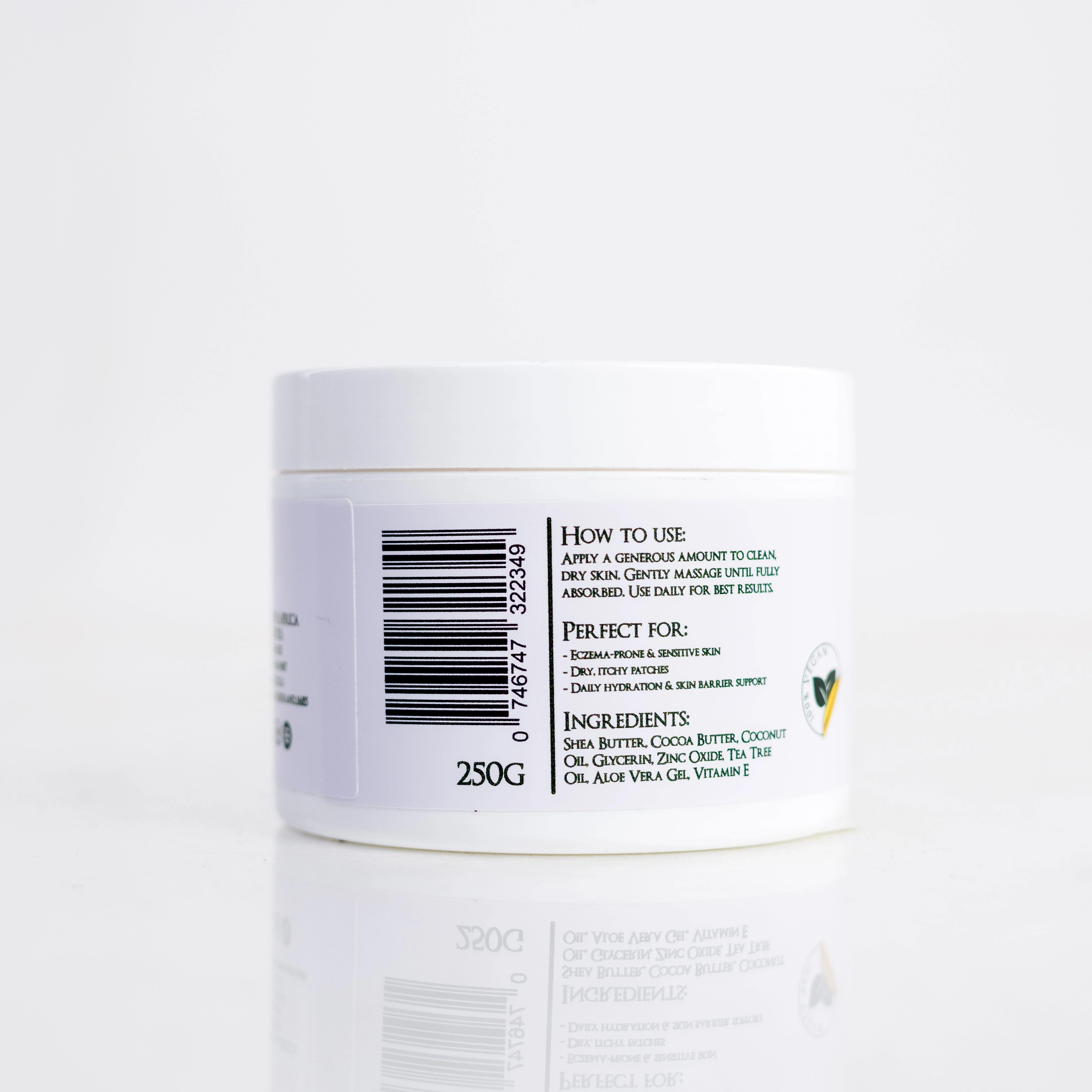 Eczema Relief Body Butter Size:250G | Price: R260,00 Soothe. Restore. Protect. Relieve and calm eczema-prone skin with Revibe Organics Eczema Relief Body Butter. This rich, non-irritating formula is crafted with 100% unrefined Ghana shea butter, cocoa butter, and zinc oxide to deeply hydrate and shield sensitive skin. Infused with tea tree oil, aloe vera, and vitamin E, it helps reduce inflammation, relieve itching, and promote overall skin repair. Perfect for daily use on dry, irritated, or sensitive skin, this body butter provides gentle yet effective relief, naturally. How to Use Our Eczema Relief Body Butter