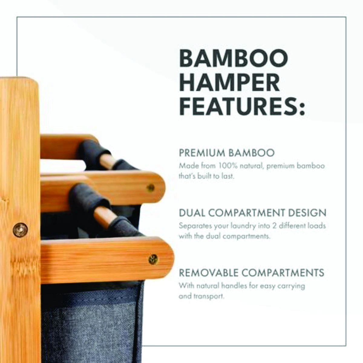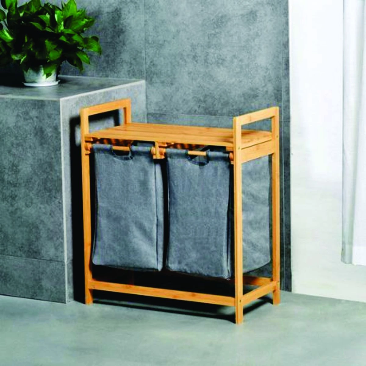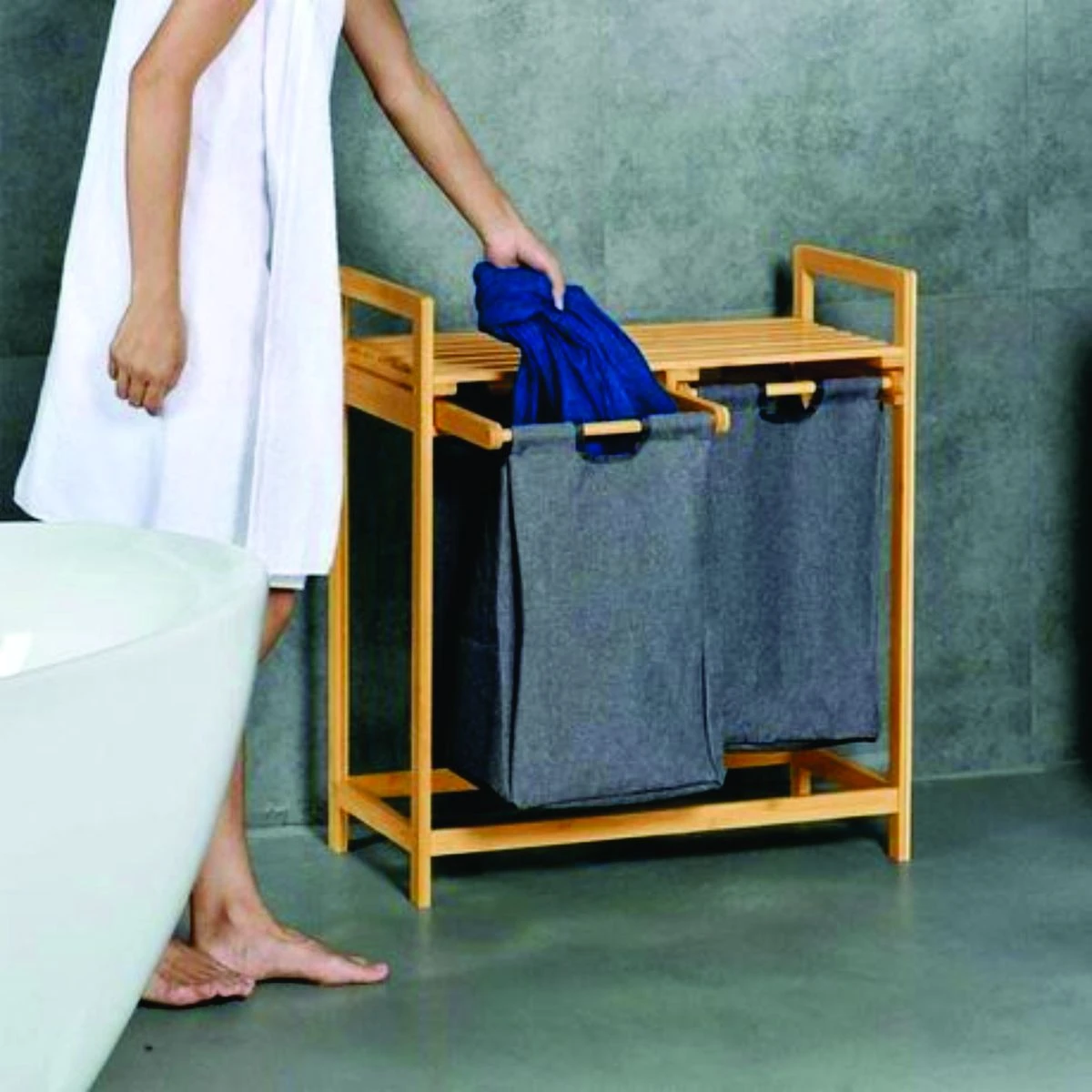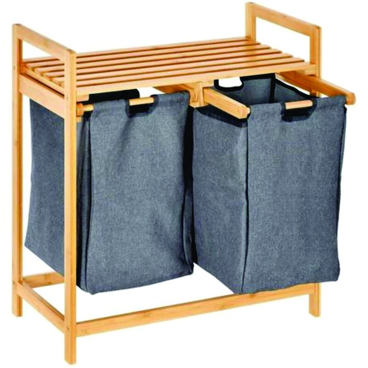 The combination of a laundry basket and storage shelves creates an ideal storage solution. The storage rack is designed to accommodate detergents, clothes, towels, and various bathroom essentials. It is paired with a spacious Oxford laundry basket, providing plenty of storage space for your clothes. The laundry basket rack is meticulously crafted from durable natural bamboo, introducing a touch of nature to your laundry area. The shelves are firmly connected to sturdy legs, ensuring not only substantial load-bearing capacity but also effective resistance to moisture. The laundry basket features a tilted design and easy-to-use handles for effortless use. You can easily slide the basket or transport dirty clothes by folding it slightly. When not in use, lifting the Oxford laundry basket allows for convenient cleaning of the rack. Beyond its role as a fabric laundry basket, this unit doubles as a hamper with lid for storing toys, books, linens, groceries, and more. This dual function maintains cleanliness and organization in your bathroom, bedroom, and living room. Plus, the laundry basket is versatile enough to serve as a shopping hamper for your daily essentials. Laundry baskets may show slight wrinkles upon initial assembly due to folding during shipping. However, these creases will naturally fade over time. Therefore, you can purchase with complete confidence. What's in the box 1 x Bamboo Laundry organizer |
