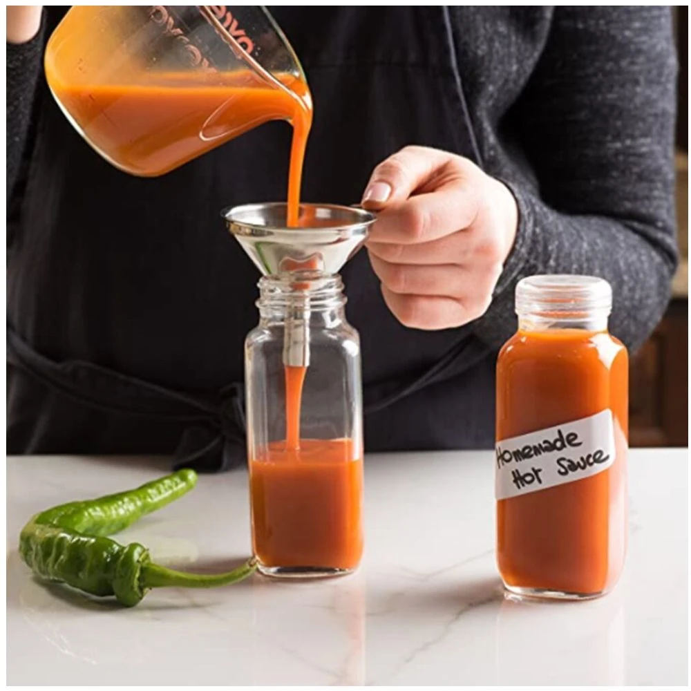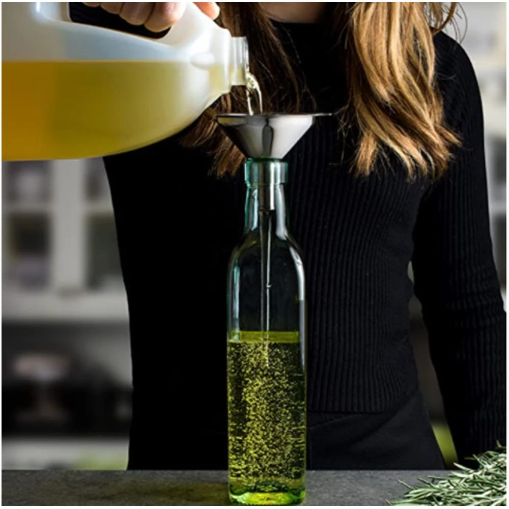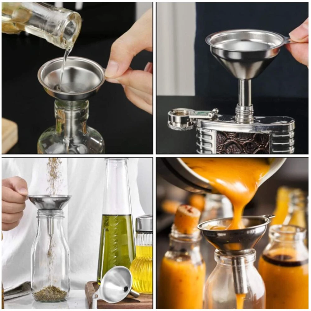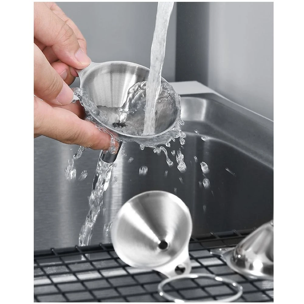 Ergonomic design funnel with long handle helps to conveniently place the small funnel on jars or glass bottles. Grooves in the stem are used to escape air, allowing ingredients to flow down more smoothly without spilling and keeping kitchen counters tidy. Premium material kitchen funnels are made of 304 stainless steel, no rusting and sturdy. Funnels for filling bottles are very simple to clean and maintain, which can prevent splashing and leakage leading to waste. Funnels for kitchen use helps to transfer to the bottle quickly and accurately. Its narrow mouth is suitable for most bottlenecks and can transfer jam, oil, powder, pepper, vanilla or spices to shakers or jars. 3 mini funnels of different sizes that can be folded together to save space. Adjustable interlocking round loops string 3 funnels together for easy hanging storage and next use. Sizes: L=7.5x6.5cm M=5.5x5cm S= 4.5X3.7cm What's in the box 3 x Liquid Funnels (L=7.5x6.5cm, M=5.5x5cm, S=4.5x3.7cm) |