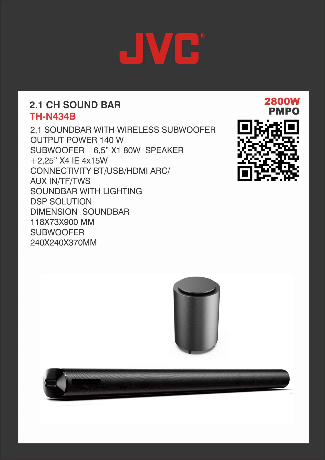 Bluetooth function 3D EQ effect LED display HDMI (ARC) input USB input Aux input Remote control 1 Year Warranty JVC 2.1 Channel 140W Sound Bar TH-N434BUpgrade your home entertainment with the JVC TH-N434B 2.1 Channel Sound Bar, designed to bring high-quality audio and deep bass to your movies, music, and gaming sessions. With 140W of total power output, this sound bar delivers crystal-clear sound, ensuring an immersive listening experience in any room. Powerful 140W Sound Output – Experience crisp, detailed audio with enhanced bass for a rich and dynamic soundscape. 2.1 Channel System with Deep Bass – Enjoy well-balanced sound with a built-in subwoofer for powerful low-end frequencies. Wireless Bluetooth Connectivity – Stream music seamlessly from your smartphone, tablet, or other Bluetooth-enabled devices. Multiple Connectivity Options – HDMI ARC, Optical, AUX, and USB inputs ensure compatibility with various devices, from TVs to gaming consoles. Slim & Space-Saving Design – A sleek, modern profile that fits perfectly under your TV or can be wall-mounted for a clutter-free setup. Easy Setup & User-Friendly Controls – Comes with a remote control for effortless volume adjustments and sound mode selection. Designed for a seamless and immersive audio experience, the JVC TH-N434B Sound Bar is the perfect addition to any modern home, offering a cinematic sound upgrade with convenience and style. |