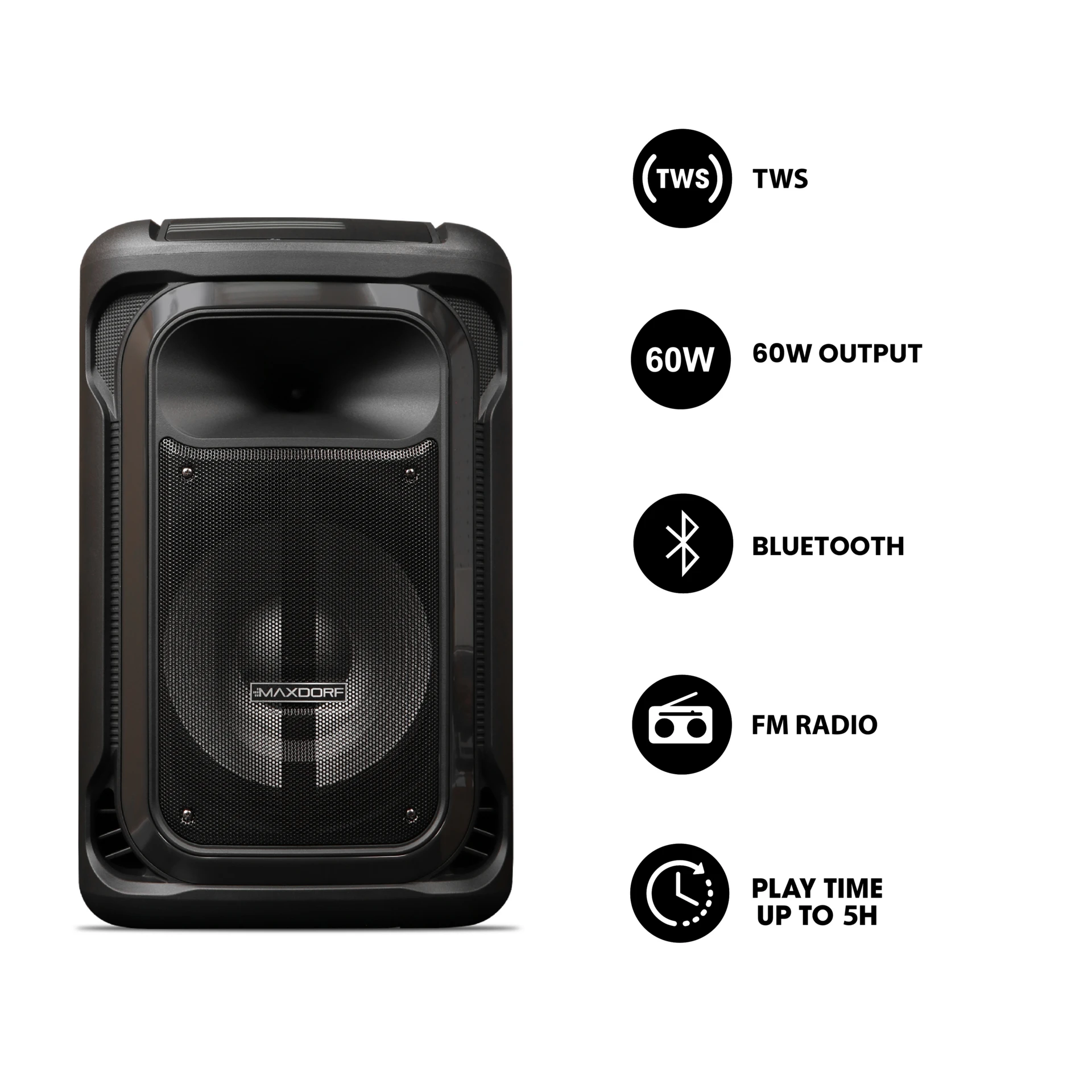 Max output: 180w Bluetooth version: 5.0 Bluetooth, Aux In, AUX, FM, USB Charge time: 3.5 hours Play time: 5 hours Built-in equalizer 1 Year Warranty Maxdorf Blaster Series - 180W Trolley SpeakerUnleash an unparalleled audio experience with the Maxdorf 180w Trolley Speaker from the Blaster Series, designed to redefine party dynamics. Boasting a commanding 180w maximum output,this powerhouse ensures crystal-clear vocals, thumping bass, and immersive soundscapes. Crafted for dynamic versatility, its sleek, portable design with a convenient trolley makes it effortlessly transportable, setting the stage for unforgettable gatherings. Beyond raw power, the speaker offers a carefully tuned, multidimensional sound, creating a sonic journey that transcends expectations. Elevate your celebrations with the Maxdorf 180w Trolley Speaker, where every beat becomes an unforgettable memory. Audio Prowess With an astounding 180w maximum output, the Maxdorf 180w Trolley Speaker guarantees a powerful and clear audio performance that transforms any gathering into a musical extravaganza. Connectivity Versatility Experience seamless wireless connectivity through Bluetooth 5.0. Unleash a myriad of input options, including Aux In, USB, TWS (True Wireless Stereo), TF Card, Guitar In, FM Radio, and 2 x Mic In, providing unparalleled flexibility for diverse music sources and live performances. Portable Entertainment Hub Designed for convenience, this trolley speaker features a portable design with a sturdy handle and wheels, ensuring easy transportation and setup wherever the party takes you. It becomes your mobile entertainment hub. Extended Playtime and Rapid Charging Keep the festivities alive with up to 5 hours of playtime, and recharge swiftly in just 3.5 hours, ensuring continuous and uninterrupted music enjoyment. Visual Extravaganza The LED display offers real-time information, while the dynamic LED light display creates a visually stunning ambiance. This visual spectacle enhances the overall party atmosphere, making the Maxdorf 180w Trolley Speaker the focal point of any celebration. Transform your gatherings with the Maxdorf 180w Trolley Speaker - Blaster Series, boasting a commanding 180w for a powerful audio experience. Enjoy seamless connectivity through Bluetooth 5.0 and versatile input options, including Aux In, USB, TWS, TF Card, Guitar In, FM Radio, and 2 x Mic In. The portable design, featuring a handle and wheels, ensures easy transportation for on-the-go entertainment. With a swift 3.5-hour charge time, revel in up to 5 hours of uninterrupted playtime. The LED display and dynamic LED light display create a visually stunning ambiance, making it the ultimate party companion. |