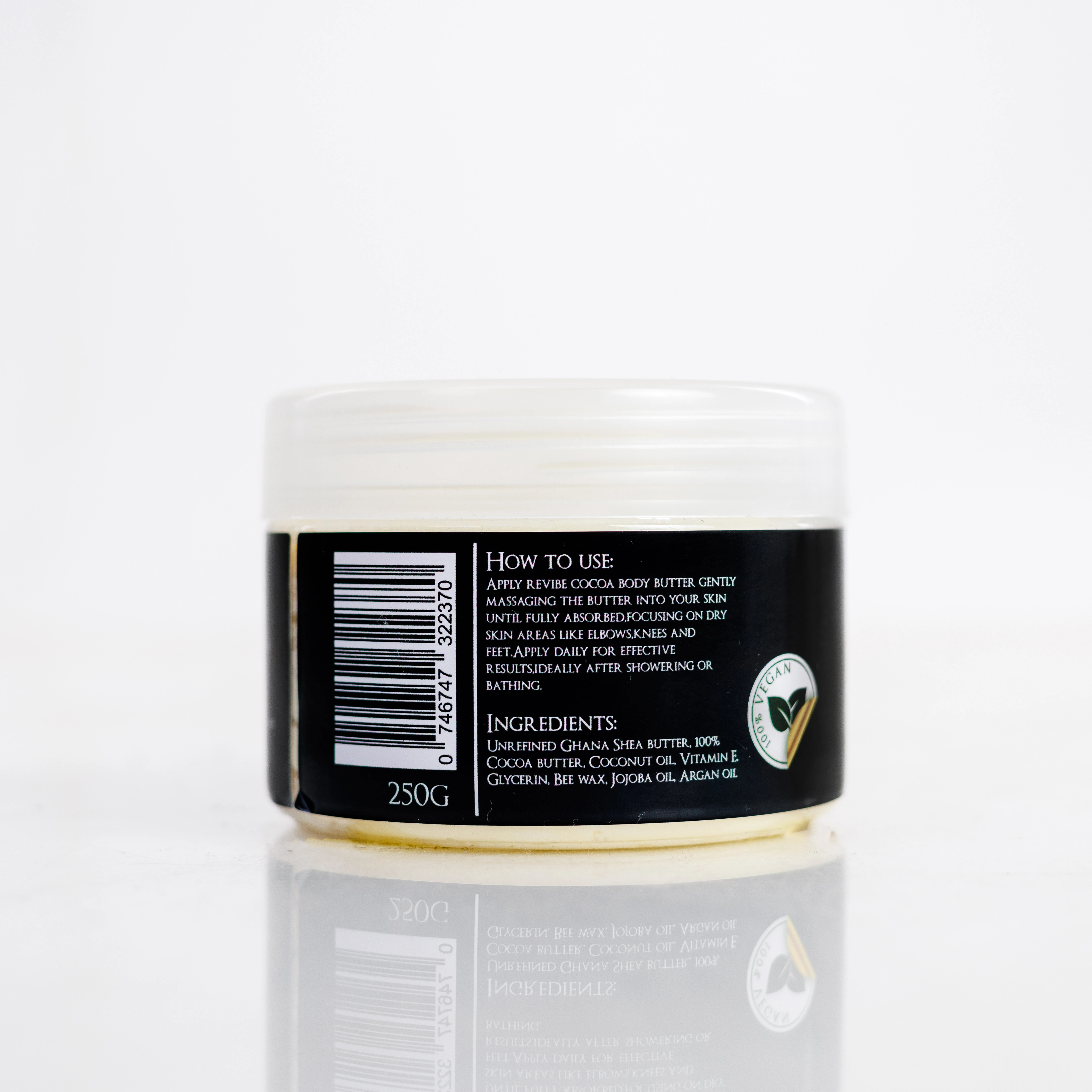 Men Cocoa Body Butter Size:250g|Price: R300.00 Rich. Nourishing. Naturally Bold. Indulge in the rich, velvety texture of Revibe Organics Men Cocoa Body Butter, crafted with 100% cocoa butter and a powerful blend of plant-based oils. This intensely hydrating formula is designed to deeply moisturize, soothe dryness, and support skin elasticity, leaving skin smooth, firm, and revitalized with a clean, natural scent. Perfect for everyday use, especially after showers or long days this body butter locks in moisture and restores skin without greasiness. How to Use Our Men Cocoa Body Butter