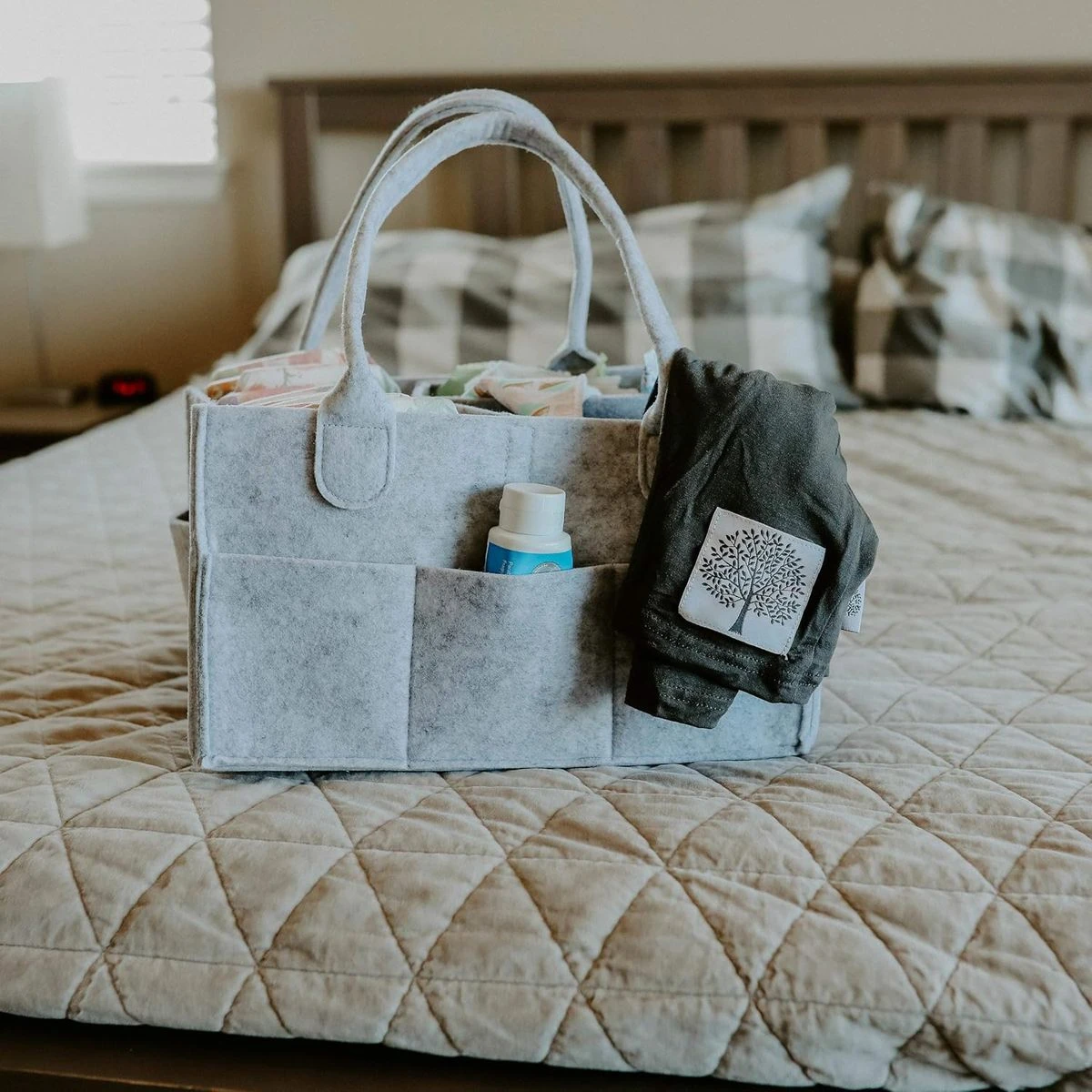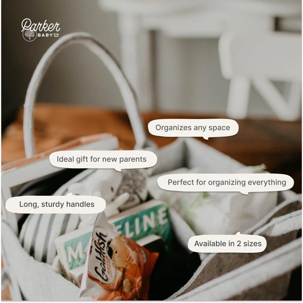 The Parker Baby Diaper Caddy Organizer is a patented organizer designed for all your baby essentials. It accommodates diapers, wipes, clothes, toys, changing pads, and more. The removable organizer insert allows it to double as a toy storage bin or nursery basket. Complement your nursery decor with our neutral diaper organizer. Its sleek and functional design looks great on changing tables, dressers, or beside diaper pails. The caddy features sturdy outer pockets for additional baby storage, keeping everything within easy reach during diaper changes. With a long, durable handle, this lightweight changing table organizer is easy to move around. Use it as a car caddy or car organizer, making on-the-go parenting a breeze. Store breast pump and accessories, baby bath products, or keep it bedside for convenient access during late-night feedings. It's the perfect companion for your parenting journey. The Parker Baby caddy makes a thoughtful and practical baby shower gift. It's an essential item for every baby registry, offering new parents a stylish and organized solution for diaper changing. Give the gift of convenience and style to expecting parents. Crafted from soft felt, our diaper caddy is built to last. The high-quality materials ensure durability and easy maintenance. We stand behind the product with a satisfaction guarantee, making your purchase risk-free. Elevate your diaper organization with the Parker Baby Diaper Caddy - the ultimate diaper bag essential and nursery organizer. What's in the box 1 x Baby Diaper Caddy 1 x Learning book |