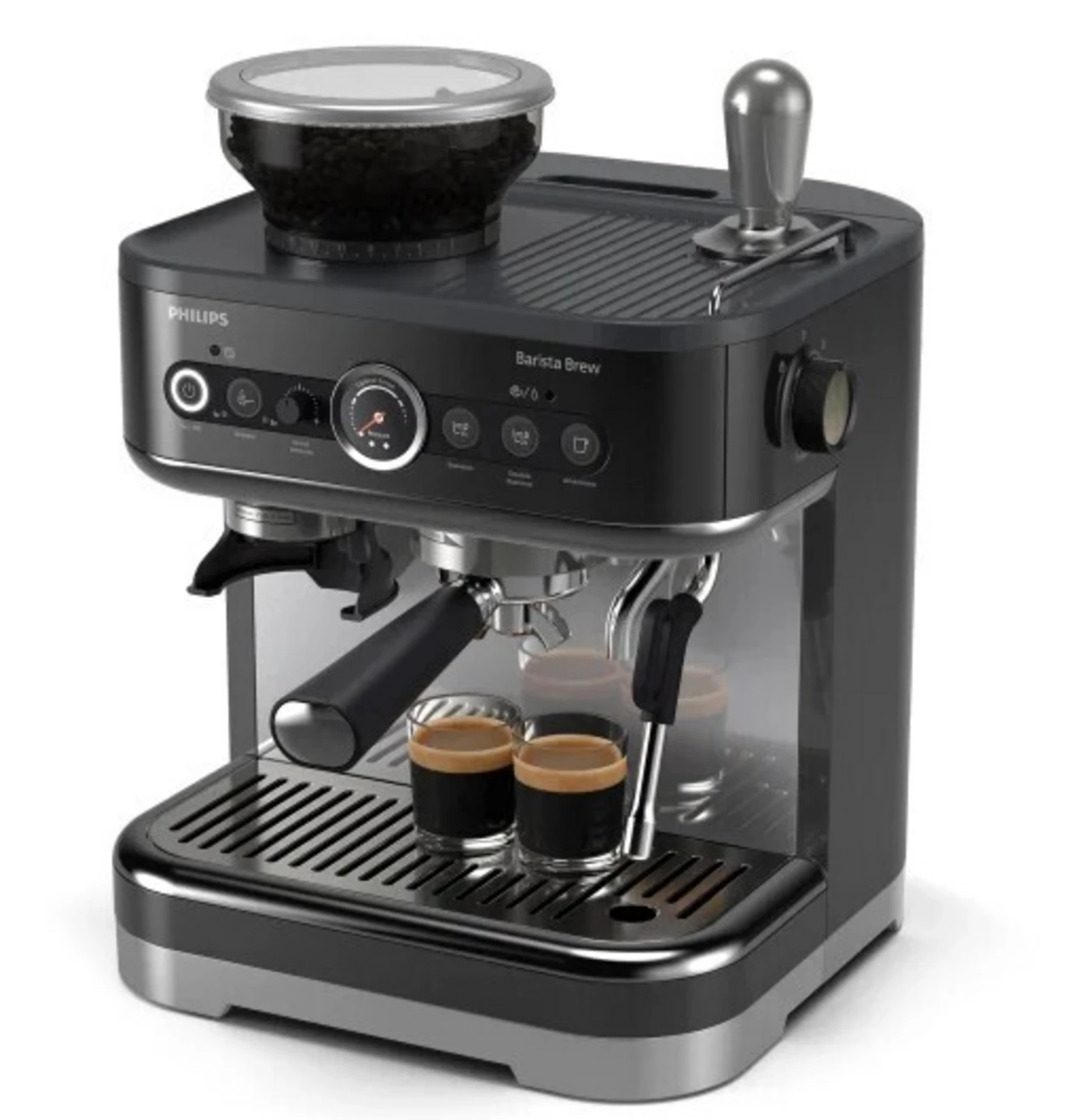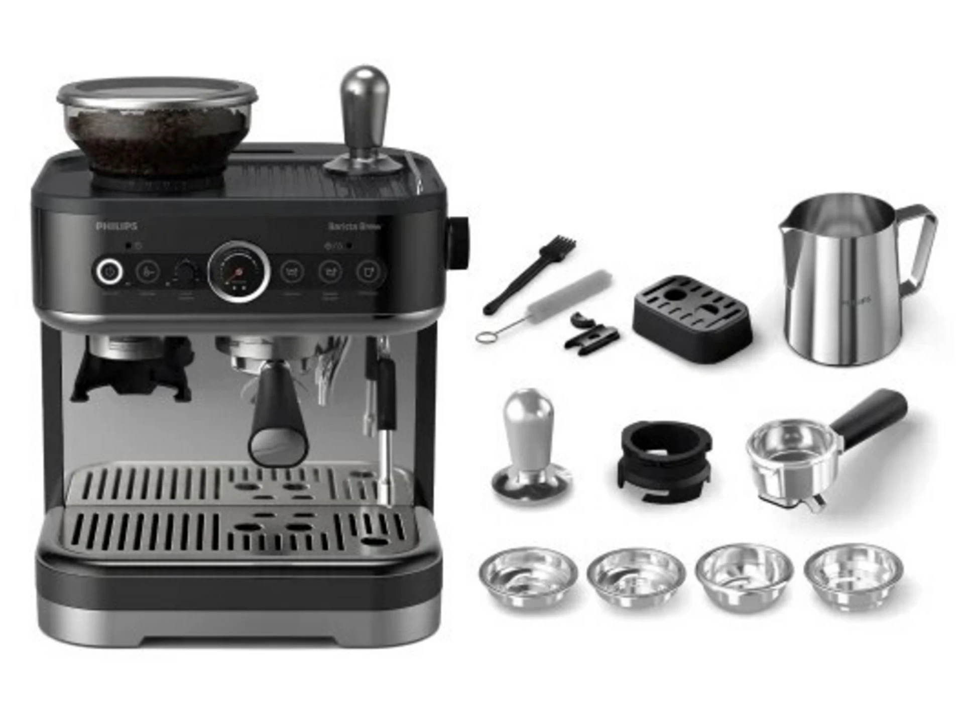 250g Bean container 58mm Stainless steel portafilter Premium calibrated tamper Stainless-steel milk jug Countertop-friendly tamping system The PID temperature control system Anti-fingerprint coated metal housing Metal conical burr grinder |