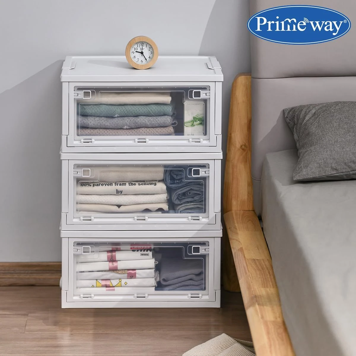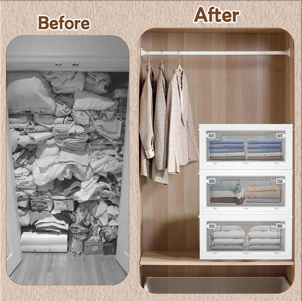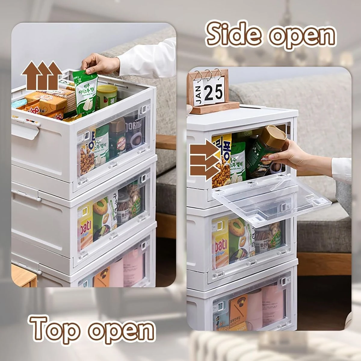 The Foldable Storage Container with Transparent Door makes it easier to locate items without unstacking the container. You can easily move things and get what you need in a transparent Folding storage container without taking off the lid. The top removable lid is designed for easy storage of large items. Built-in Transparent door latch locks the door to ensure it does not open automatically. There are Two Detachable handles on both sides of this Foldable storage container, which makes it easy to bring them up and stack them together. The storage container with a door is foldable when not in use, and you can put it under a desk or sofa; it won't take up any more room in your office. Our storage container is stronger material and innovative design compared to a fabric storage box. Our plastic storage bins are installation-free and visible to locate articles, compared to the wooden closet storage cabinet This folding storage container is made of high-quality plastic, durable, with strong load-bearing capacity, not easy to deform or crack, and suitable for long-term repeated use. What's in the box 1 x Foldable Storage Organizer |