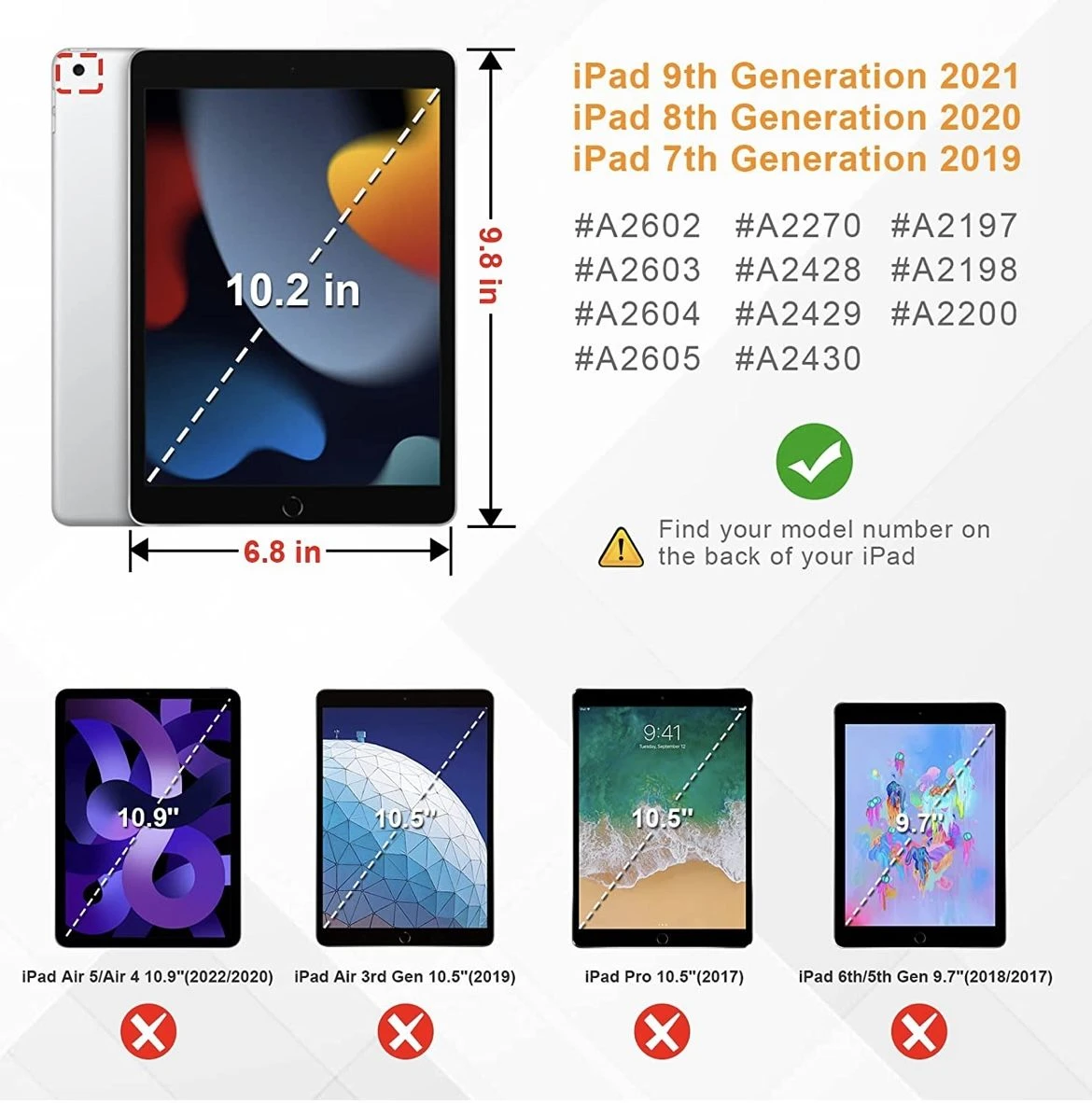 Shockproof Protective Case Compatible for iPad 9th/8th/7th Generation 10.2" Designed for iPad 9th/8th/7th Generation 10.2" The Ultra Slim and Lightweight hardback design, adds minimal bulk while offering your device great protection. Classic and professional design. Full access to all features (Cameras, Speakers, Ports, and Buttons) Magnet secures the case closure, easy snap on and off. This case is made of durable rubberized material with a built-in shockproof lining. It will protect your 10.2 iPad from scratches and accidental drops, bumps, and impacts. Make your wrist and posture more comfortable, without any pressure. Unique brushed texture on both front and back cover makes your iPad more elegant and fashionable and protect your device against fingerprints and scratches as well Classic and professional design; Magnet secures the case closure; Full access to all features (Cameras, Speaker, Ports and Buttons) What's in the box 1 x Shockproof Protective Case Compatible for iPad 9th/8th/7th Generation 10.2" |