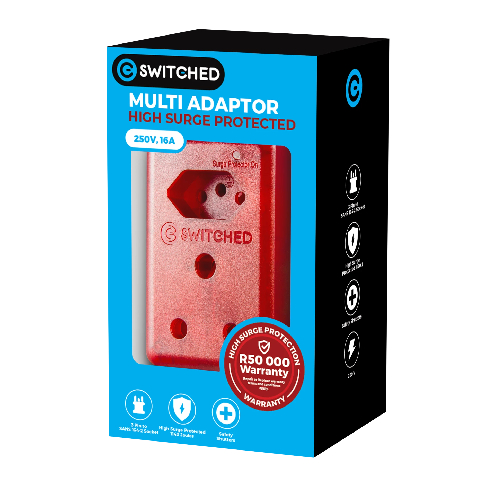 16A rating Surge protected 1140 Joules 3 Pin to SANS 164-2 socket Safety shutters Surge LED status light 1 Year Warranty Switched High Surge Multi AdaptorThe High Surge Plug Adaptor offers 1140 joules of surge protection and safety shutters to prevent accidental contact with live parts. It provides a secure connection for charging and powering electronic devices, ensuring reliable protection against power surges. |