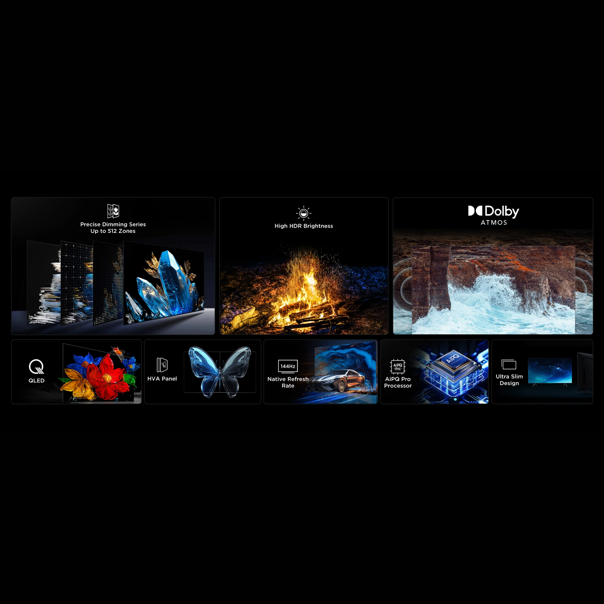 Precise Dimming Series Up to 512 Zones High HDR Brightness 1000 Nits HVA Panel ONKYO 2.1 Hi-Fi System AiPQ Pro Processor 144Hz Native Refresh Rate Google TV 3 Year Warranty |