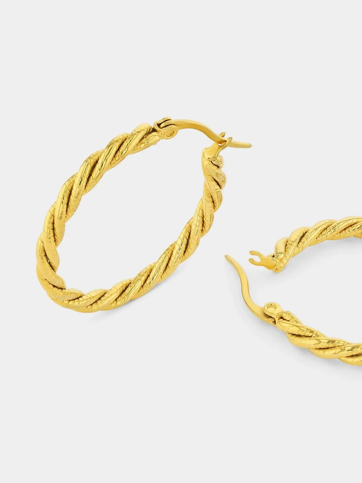 These stylish 30mm twisted hoop earrings are expertly crafted in Gold Plated Stainless Steel. They’re waterproof, anti-tarnish and boast a 1-year guarantee. Dimensions 30*3mm Metal content Stainless Steel Metal colour Gold Plated Fibre content STAINLESS STEEL Strap colour STAINLESS STEEL Weight 0.00652g |