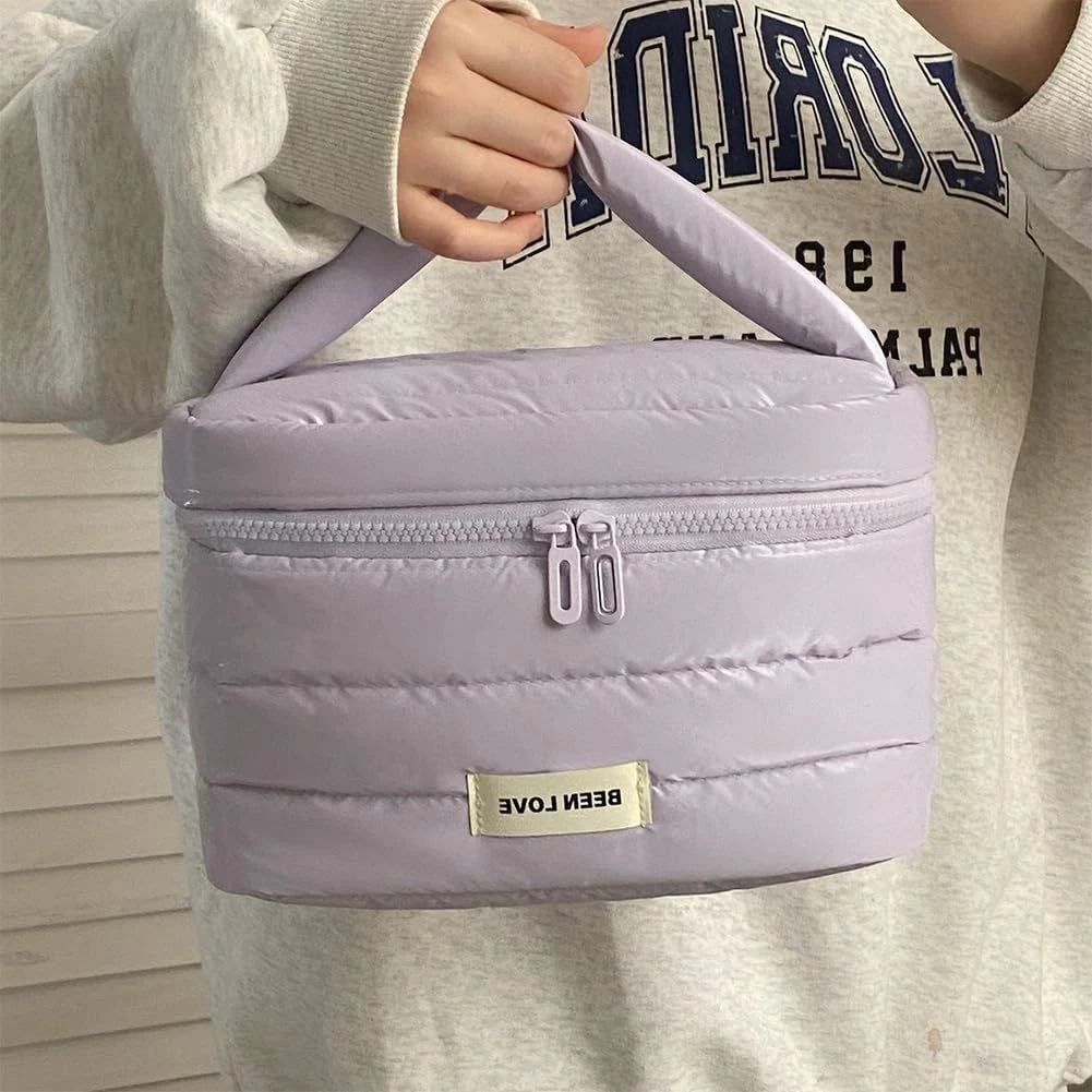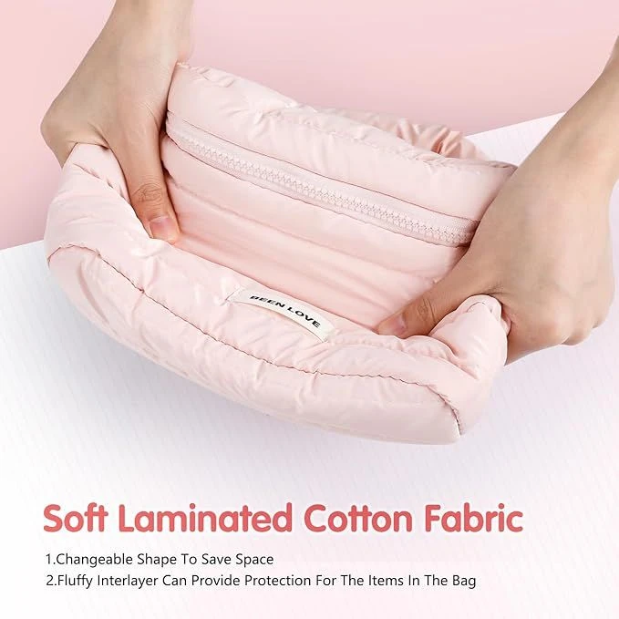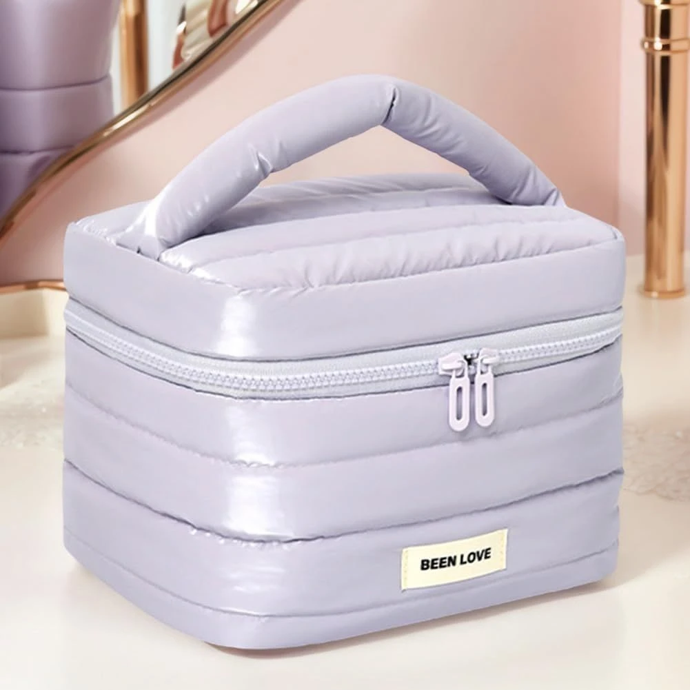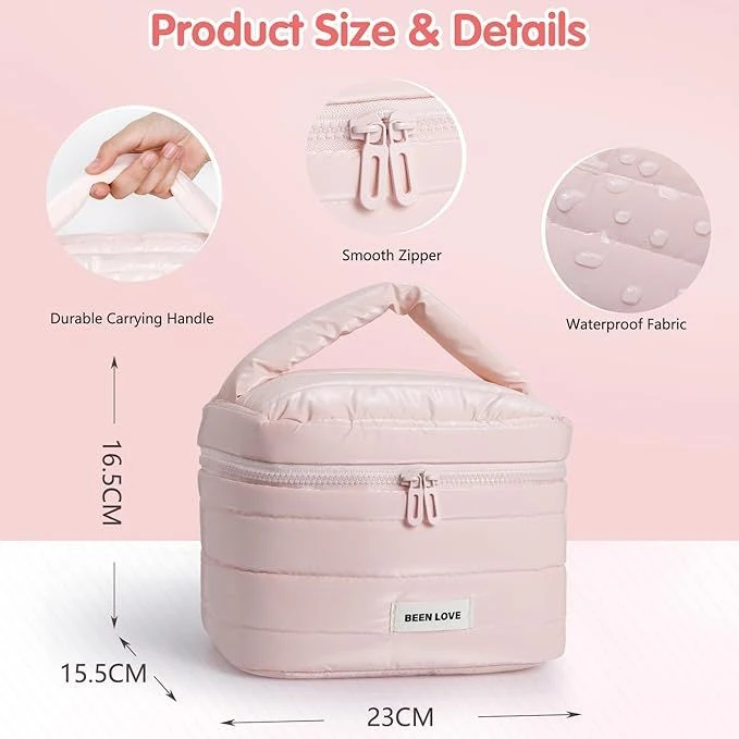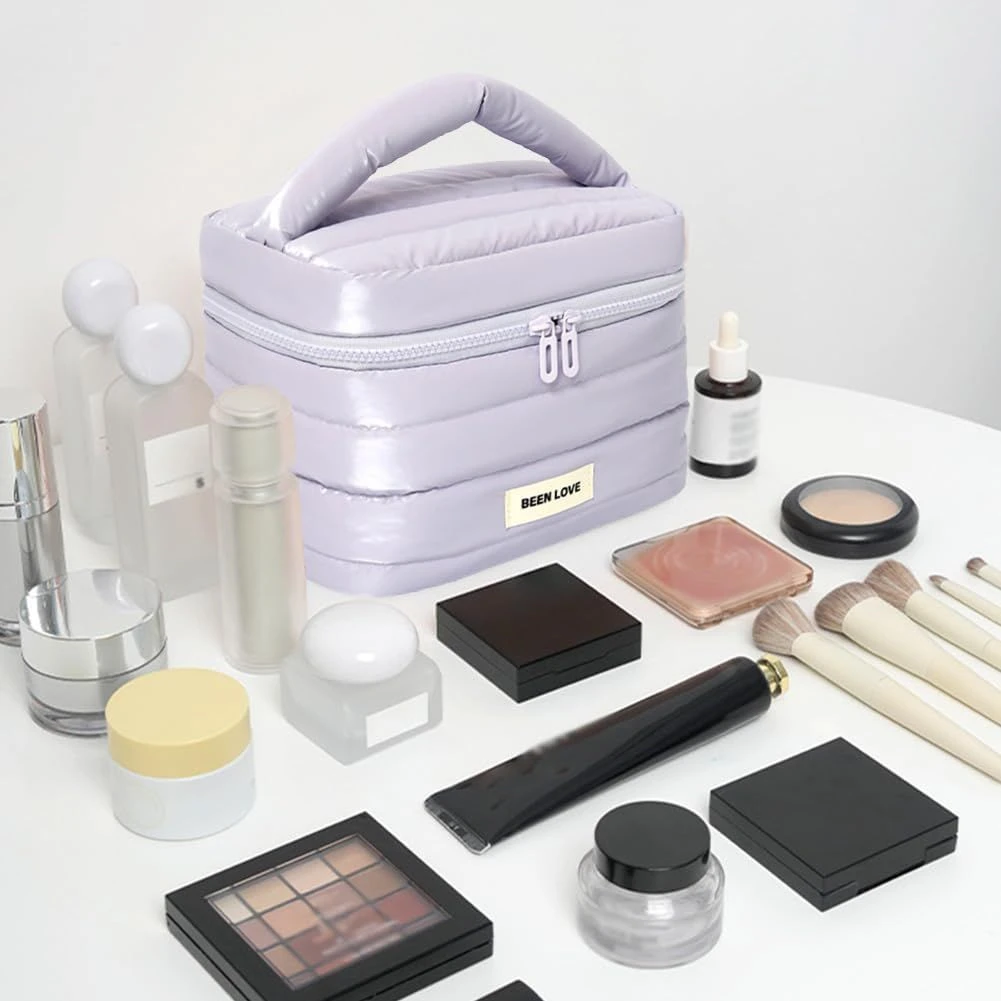 - Down jacket fabric, lightweight and waterproof: This bag is made of down jacket fabric, which is lightweight and easy to carry, easy to clean, allows you to quickly apply makeup after your daily commute or fitness workout, and has excellent waterproof and shock-absorbing properties, which can protect your cosmetics from moisture and cracking during outdoor activities or camping. Thanks to the use of quilting technology, the bag is long-lasting.