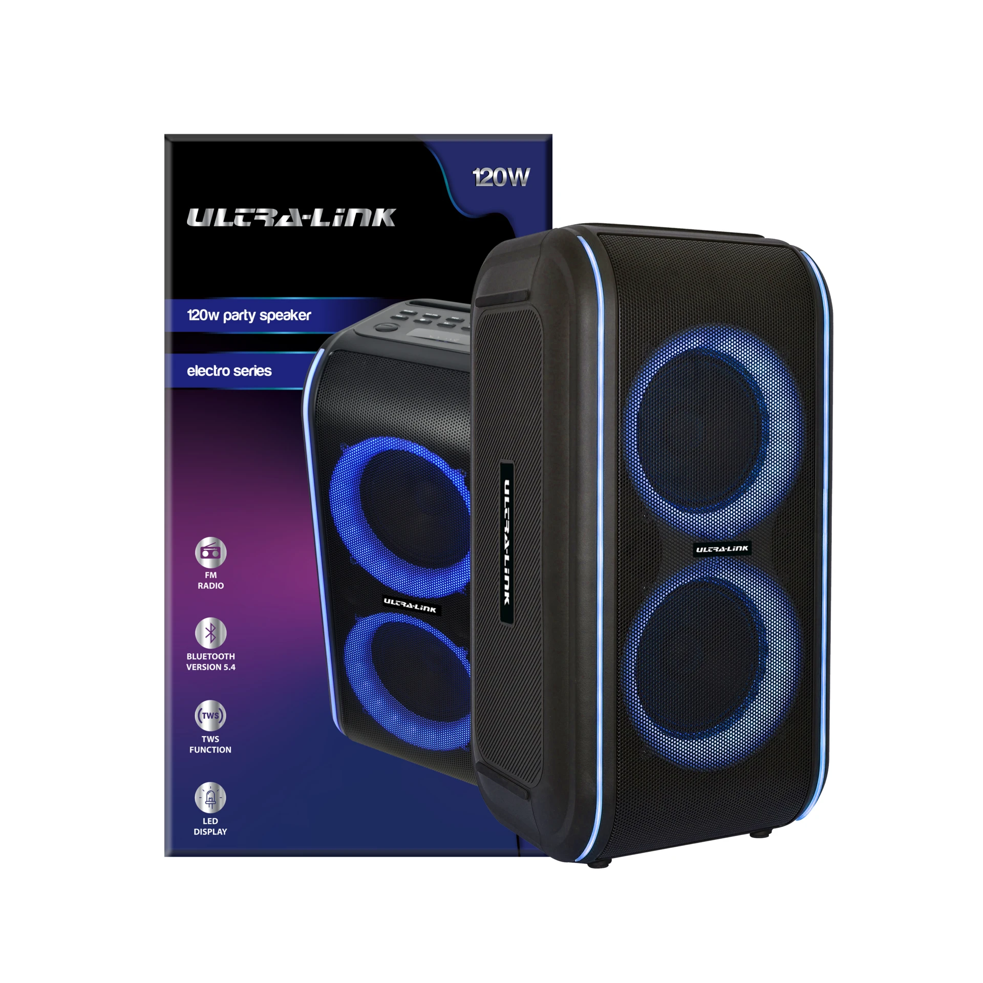 Total output power 120W Charging time up to 7Hrs Playing time up to 6hrs TWS fuction connect up to 2 devices Battery 7.4V/4400mAh FM frequency 87.5MHz-108MHz 1 Year Warranty Ultra-Link Electro Series 120W Bluetooth SpeakerExperience vibrant sound and unstoppable energy with the Ultra-Link UL-BTPS120 Electro Series Party Speaker. Perfect for lively parties, cozy home moments, or outdoor adventures, this versatile speaker delivers powerful audio that fills every space. Let the dynamic beats and crystal-clear sound elevate your mood and bring your gatherings to life with unmatched clarity and punch. |