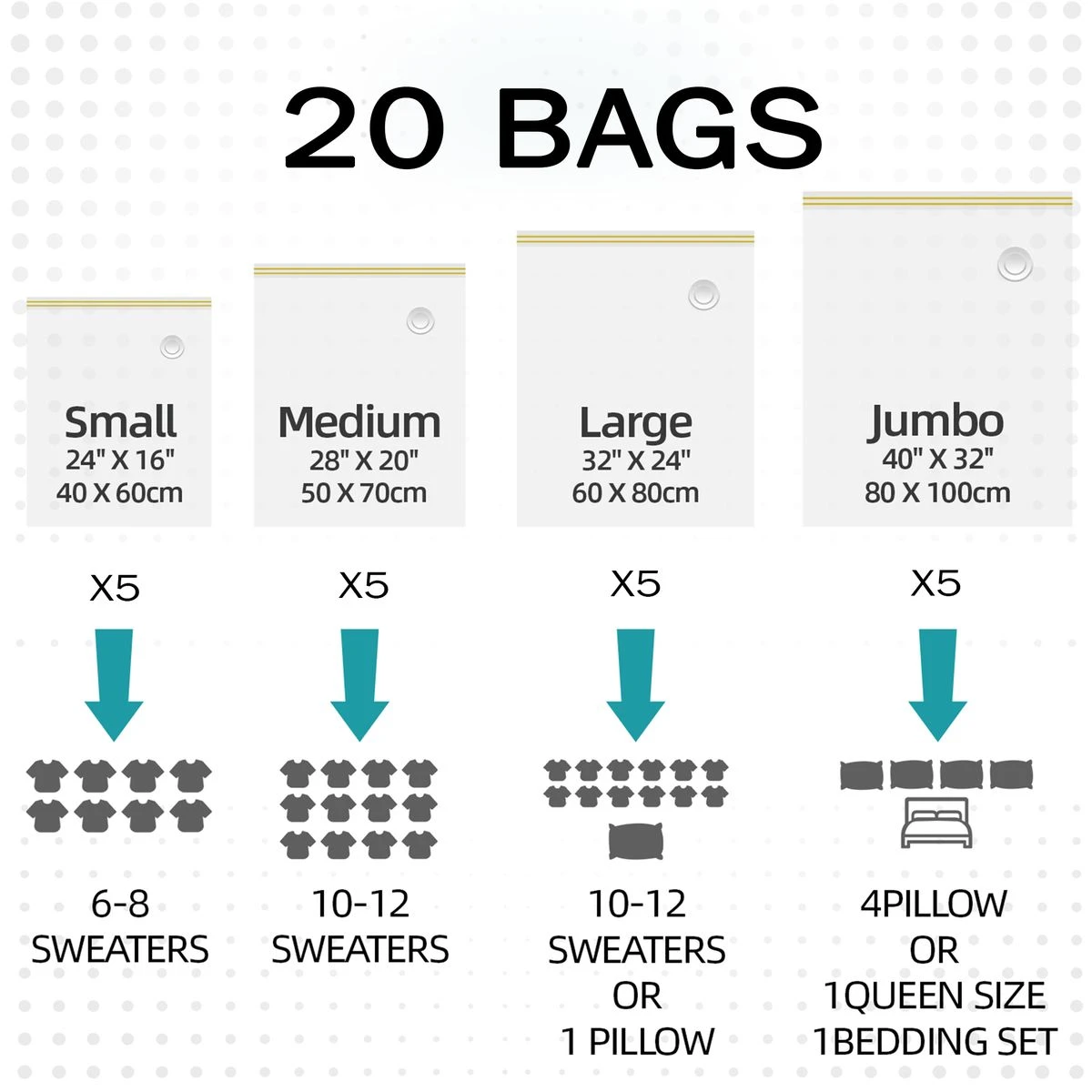 Features: - perfect vacuum bag set – our set has 20 premium vacuum bags for storage in various sizes to meet different needs. Our set of space saver bags contains 5 small bags (40 x 60 cm), 5 medium bags (50 x 70 cm), 5 large bags (60 x 80 cm), 5 jumbo bags (80 x 100 cm), and a hand pump. Can be used to store away your clothes, coats, duvet, bed sheets, towels, blankets, and more. - save up to 80% of space - without having to clean out your closet! Our spacesaver vacuum bags for storage of clothing, blankets are an ideal solution for adding more storage space to your wardrobes, closets, garages, basements, lofts, and suitcases. Avoid using plastic bins with lids, or a bulky storage tote. Use these deflatable storage vacuum bags instead. - wide application – our vacuum storage bags are essentials for both household space saving and travel organization. Function as storage bags for clothes and compression bags for travel - perfect for clothes organizing – our space saver bags help keep your items fresh and dry without worry. It is the best choice for you to organise clothes - hand pump included for easy use - works with standard vacuum cleaner. Simply put the items in our storage vacuum bag, seal the zipper, suck out the air, close the lid. You can also use the pump included to easily vacuum store your items What's in the box 5 x Small Vacuum Bags 40 x 60 Cm 5 x Medium Vacuum Bags 50 x 70 Cm 5 x Large Vacuum, Bags 60 x 80 Cm 5 x Jumbo Vacuum Bags 80 x 100 Cm 1 x Hand Pump |