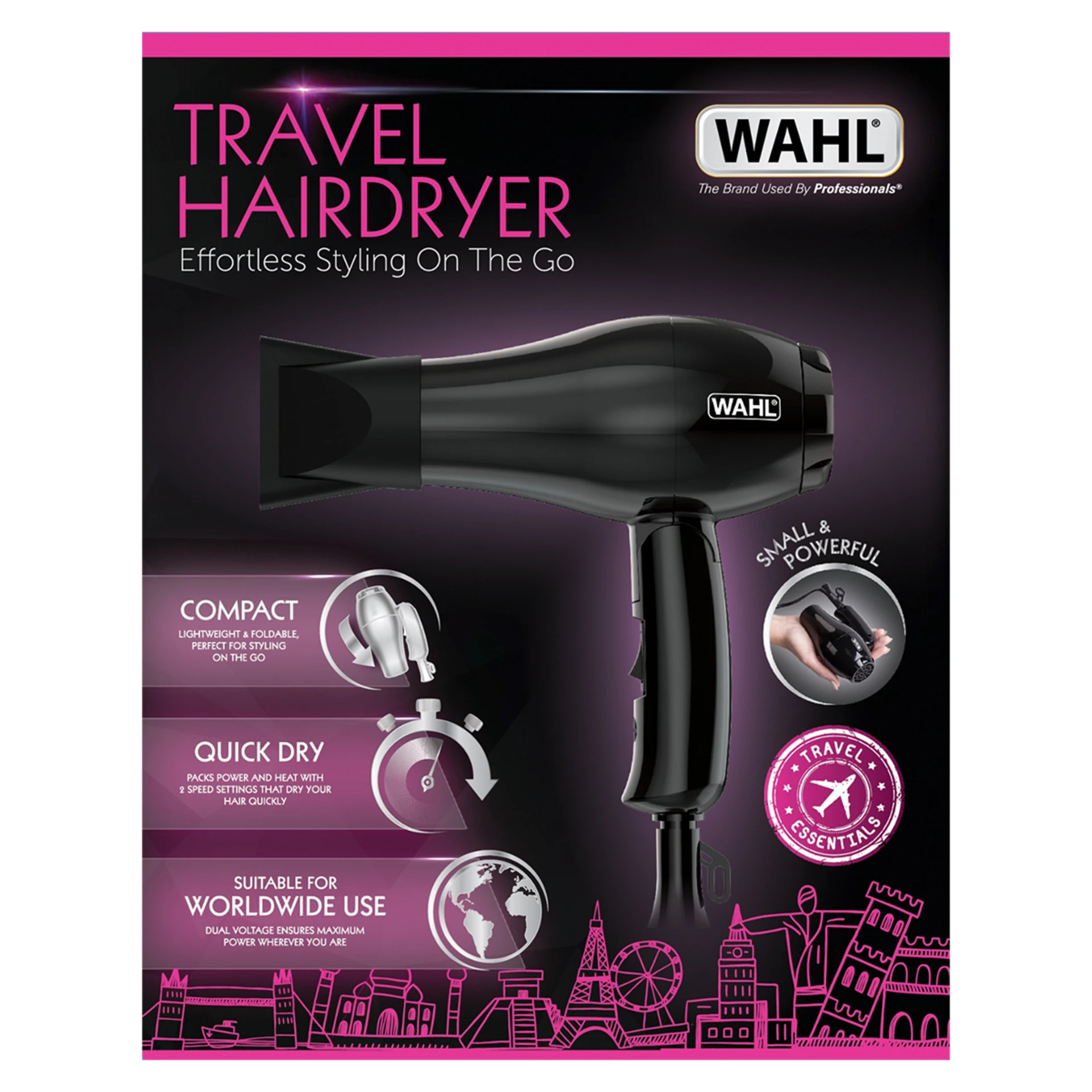 Power - 1000W Reach - 1.8m cord length Feel - Lightweight and ergonomic Function - style on-the-go with Wahl 2 Heat, 2 speed settings, dual voltage Foldable & lightweight, travel easy Wide concentrator nozzle, diffuser Wahl Foldable Travel DryerTravel Dryer™ is ultra-compact, foldable, perfect for on-the-go use. Its 1000W motor delivers fast-drying results, & the lightweight design makes styling effortless. With dual voltage, it's ideal for international travel, easily switching from 240V to 115V. |