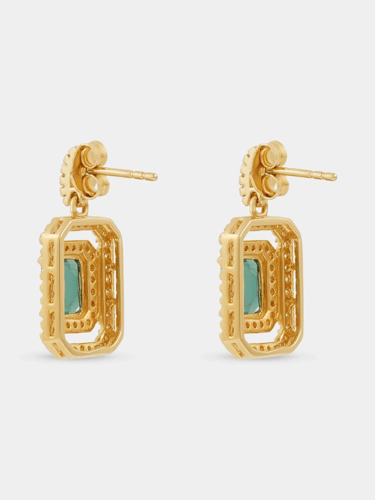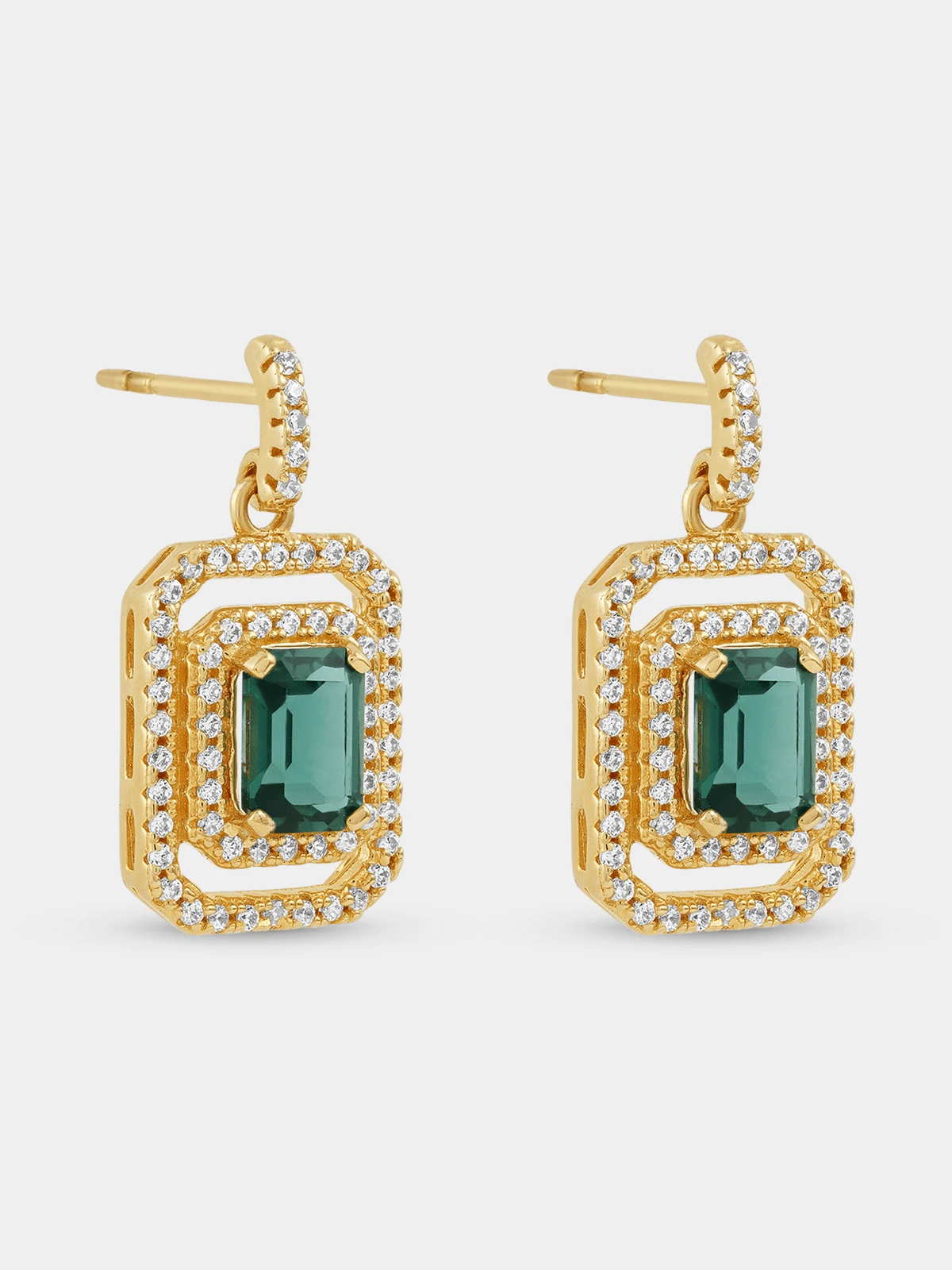 Expertly crafted in 18ct Gold Vermeil, these beautiful drop earrings feature emerald-cut green Cubic Zirconia embraced by double halos of round-cut white stones. Gold Vermeil is Sterling Silver plated with a luxurious layer of 18ct Yellow Gold. The thickness of the 18ct Gold plating is at least 2.5 microns for extended durability. Stone colour Green & Clear Material colour Yellow Gold Fibre content SILVER Material composition 18ct Yellow Gold Vermeil Dimensions + - 22.8mm x 11.6mm Gemstone Cubic zirconia |